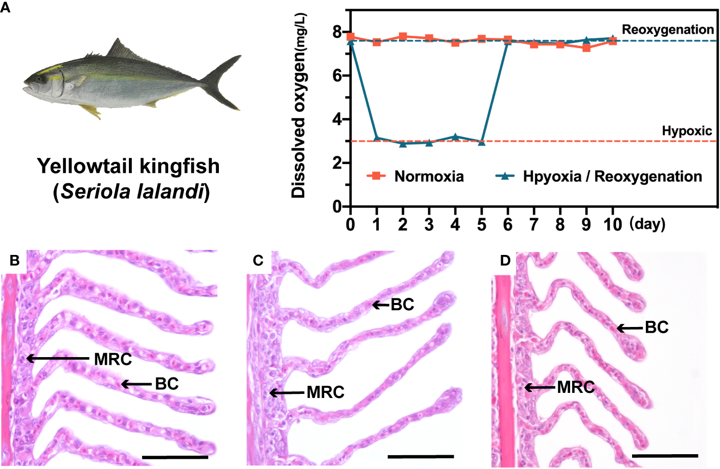 (A) Changes in dissolved oxygen levels in the experiment and corresponding gill tissue morphology. (B) is the normoxic level, (C) is the hypoxic level and (D) is the reoxygenation level. Scale bar: 50um. .