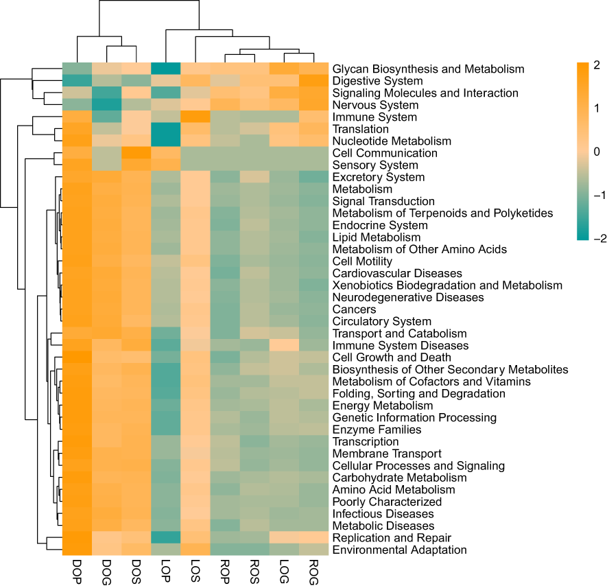 According to KEGG analysis (Figure 3), the LO and RO groups clustered close to each other, and the DO group clustered far away from them. The clustering results of the LO and RO groups were similar, and they were mainly enriched in Glycan biosynthesis and metabolism and Signaling molecules and interaction.