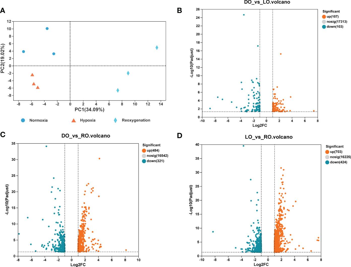Clustering of liver samples and differentially expressed genes. (A) Two-dimensional principal component analysis (PCA) plots of liver transcriptome data (B) Map of DEGs volcanoes (normoxia vs hypoxia). (C) Map of DEGs volcanoes (normoxia vs reoxygenation). (D) Map of DEGs volcanoes (hypoxia vs reoxygenation).
