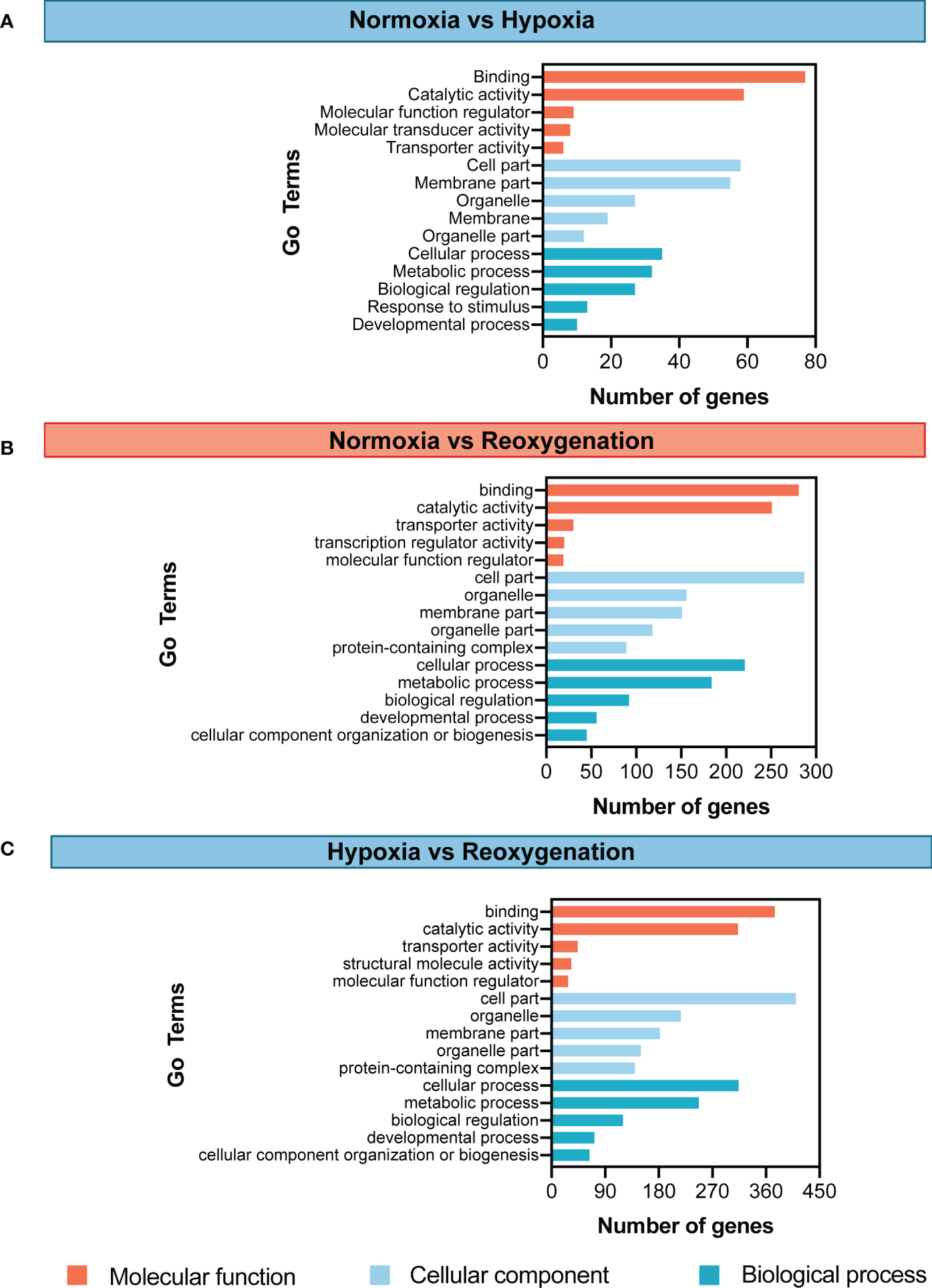 Annotation of differentially expressed genes. (A) GO annotation diagram for DEGs (normoxia vs hypoxia). (B) GO annotation diagram for DEGs (normoxia vs reoxygenation). (C) GO annotation diagram for DEGs (hypoxia vs reoxygenation).