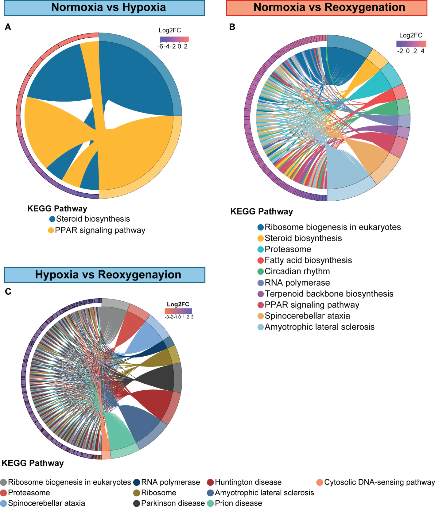 Pathway enrichment of differentially expressed genes. (A) KEGG chord plot diagram of DEGs (normoxia vs hypoxia). (B) KEGG chord plot diagram of DEGs (normoxia vs reoxygenation). (C) KEGG chord plot diagram of DEGs (hypoxia vs reoxygenation).