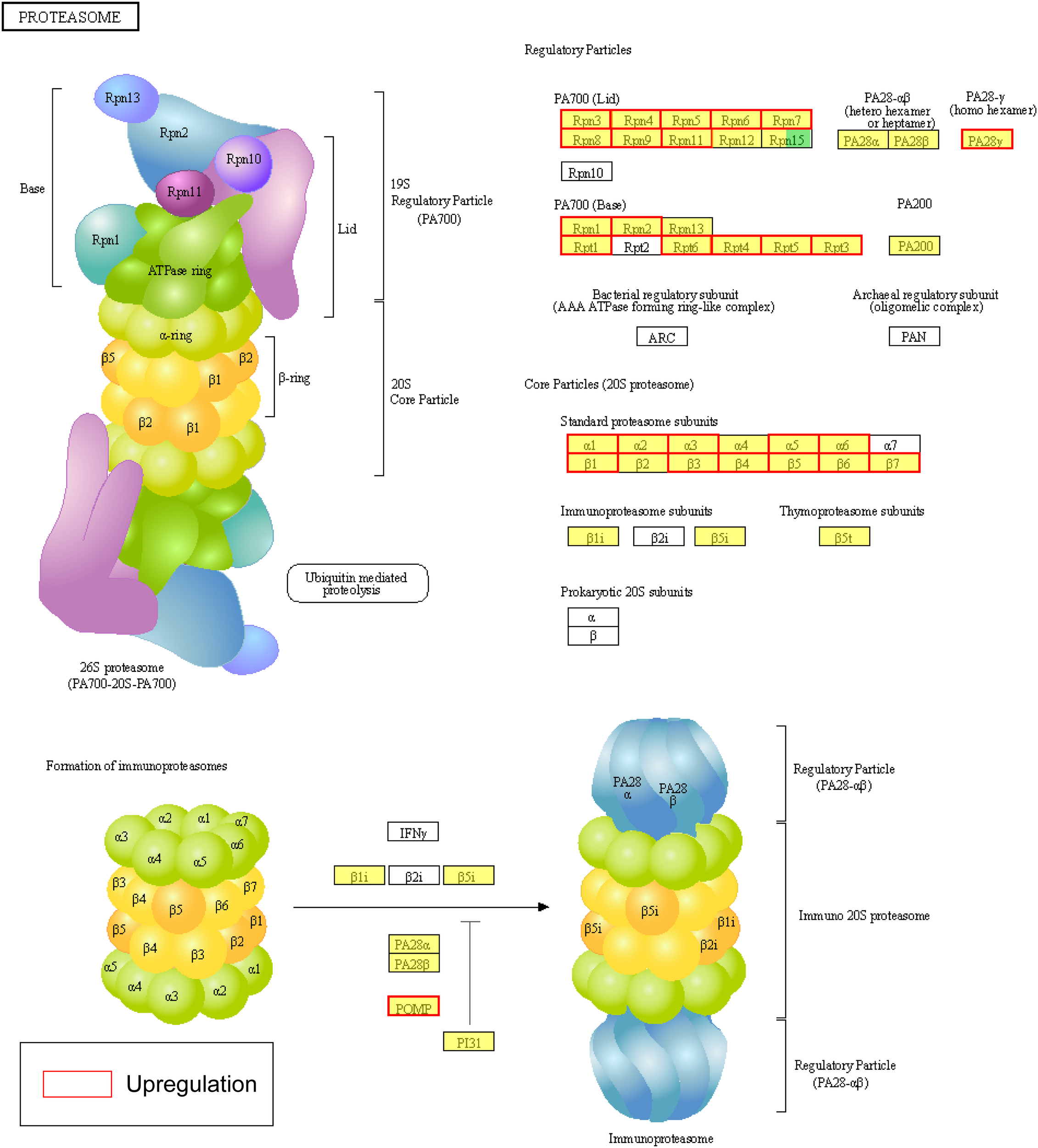 On the transcriptome level, compared with the NO group, KEGG enrichment analysis revealed that DEGs of the LO and RO groups were mainly annotated to pathways including the Steroid synthesis, Fatty acid synthesis, and Ribosome biogenesis in eukaryotes pathways, and they were also annotated to the PPAR signaling pathway, PI3K-Akt signaling pathway, and ECM-receptor interaction pathway. Compared with hypoxia, many URGs were enriched in the Ribosome biogenesis in eukaryotes pathway (Figure 8) and the Proteasome pathway (Figure 9) in the RO group. In eukaryotic cells, the ubiquitin–proteasome system and autophagy–lysosome system are two major protein degradation pathways; the proteasome removes excess damaged proteins during proteolytic activity (Nath and Shadan, 2009). Ribosomes are actively involved in protein folding during mRNA translation (Banerjee and Sanyal, 2014). Moreover, KEGG of microbiota was enriched in Signaling molecules and interaction. This suggests that the recovery process may also be regulated by the microbiota. Taken together, these results indicate that the clearance of misfolded proteins and the folding of new proteins play important roles in the recovery of the yellowtail kingfish during reoxygenation. In summary, the gastrointestinal microbiota and DEGs were all annotated to pathways associated with metabolism, cellular and molecular signaling, and protein repairment and synthesis; they may have synergetic function during the physiological adaptation changes of the yellowtail kingfish under hypoxia and reoxygenation, and the detailed mechanisms and pathways should be clarified in the future.