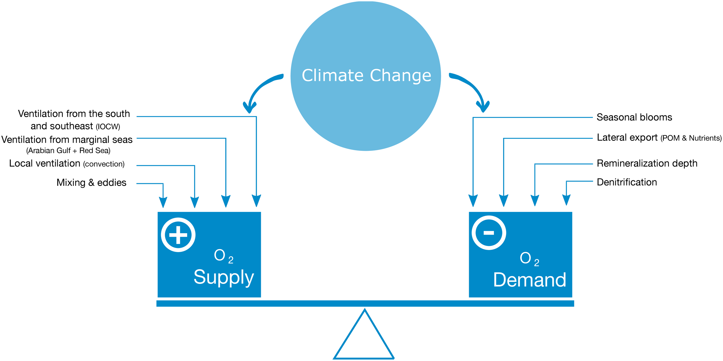 Factors controlling the Arabian Sea OMZ intensity. Main factors controlling the O2 supply (left pan of the balance) and demand (right pan of the balance) under the influence of climate change that may offset the balance, favoring deoxygenation or oxygenation.