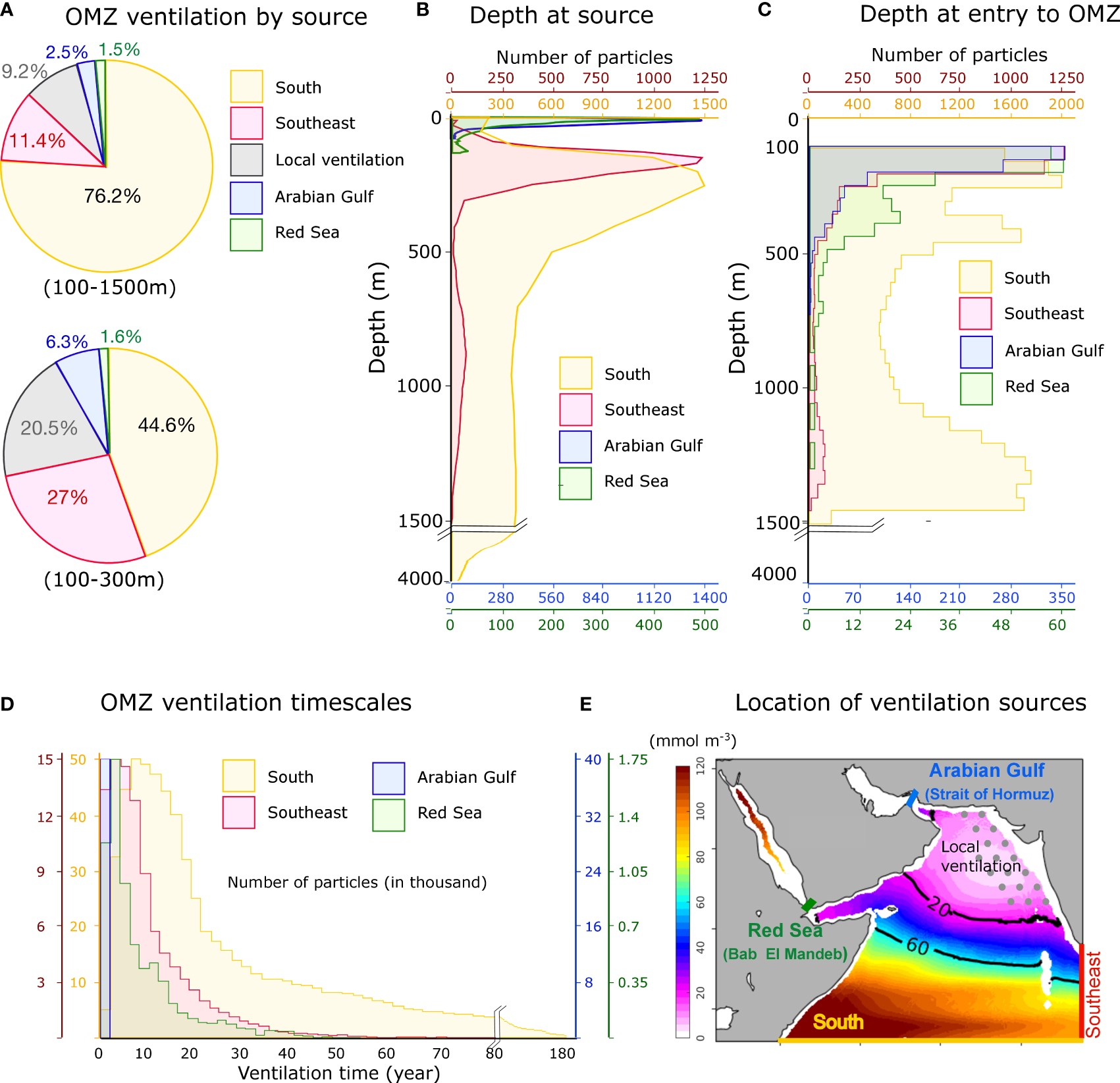 Arabian Sea OMZ ventilation sources and timescales. (A) Contributions of different source waters to the ventilation of the Arabian Sea OMZ (100-1500 m) and its upper part (100-300 m). The OMZ waters are linked through Lagrangian tracking to five potential sources associated with five sections shown in (E): south (at 5°N), southeast (at 78°E), the Arabian Gulf (Strait of Hormuz), the Red Sea (Bab El Mandeb) and the local ventilation (winter convection). (B, C) Particle depth at source (B) and at entry to the OMZ (C) associated with different remote sources. (D) Frequency distribution of OMZ ventilation timescales (in year) associated with different remote sources. Note that given the differences in the number of particles associated with each source, different sources are shown on different vertical axes in (B–D). (E) Location of the entry sections where source particles are intercepted. Grey circles indicate the area of local ventilation (where the OMZ core gets in contact with the winter mixed layer). Color shading shows annual mean O2 (in mmol m-3) averaged between 250 and 700 m.