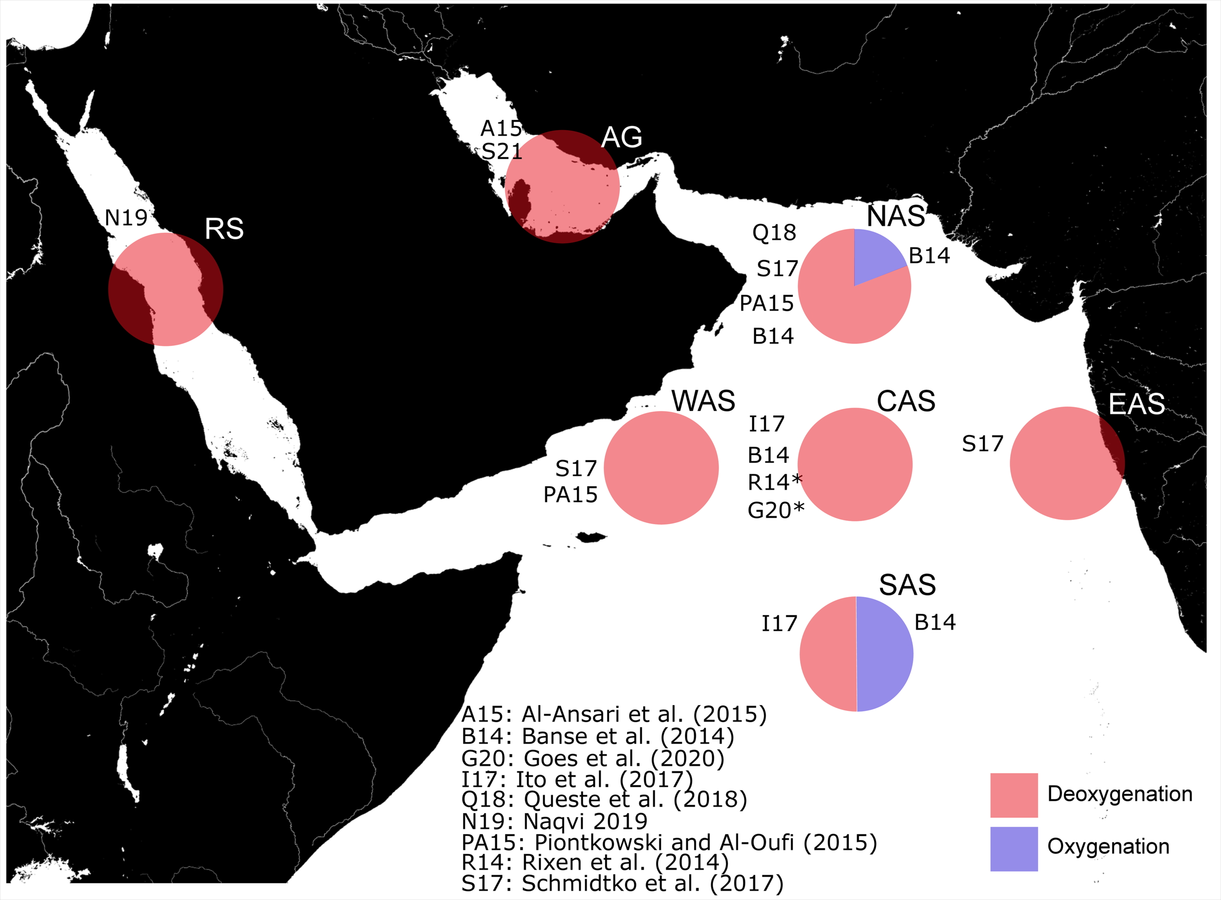 Observational studies reporting recent O2 changes in the Arabian Sea. Observational studies documenting recent O2 trends in the northern (NAS), central (CAS), southern (SAS), eastern (EAS) and western (WAS) Arabian Sea, as well as in the Arabian Gulf (AG) and Red Sea (RS). In each subregion, the proportion of studies suggesting deoxygenation (red) vs. oxygenation (blue) is indicated with a pie chart. Deoxygenation trends in studies labeled with (*) are inferred from relevant proxy data and are not based on direct measurements of oxygen.