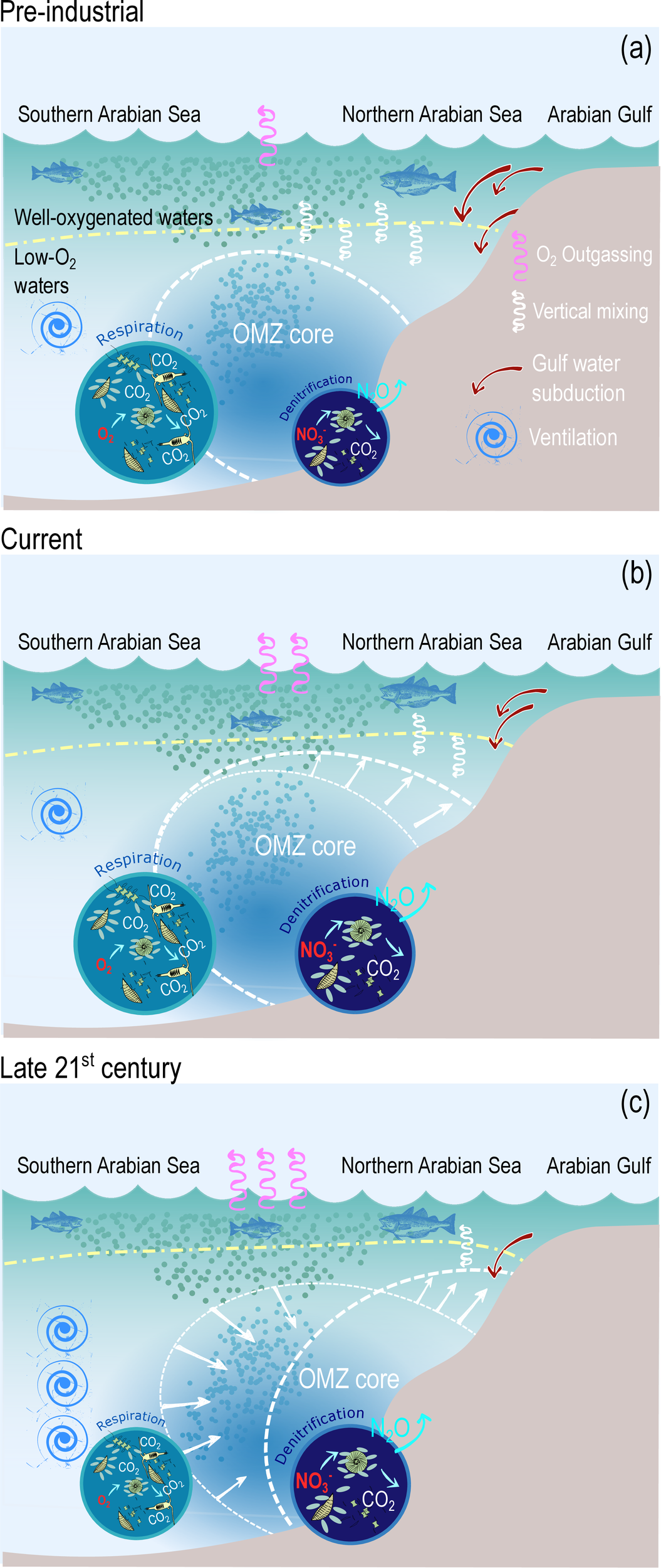 Summary of recent and potential future changes in Arabian Sea OMZ. This schematic summarizes the recent and main potential future changes in the Arabian Sea OMZ as well as their drivers and implications. (A) Pre-industrial conditions: cool conditions favor strong O2 solubility in the seawater and weak outgassing. Well-oxygenated waters (O2 > 100 mmol m-3) occupy a thick upper layer overlaying the OMZ. Strong winter convection and subduction of Gulf waters in the north ventilate the upper OMZ, thus maintaining its denitrifying suboxic core contained at depth. (B) Present-day conditions: weaker O2 solubility in the seawater causes moderate outgassing. A weaker winter convection and subduction of Gulf waters in the north cause an expansion of the upper OMZ and an increase of denitrification. (C) Future conditions: warmer conditions further lower O2 solubility in the water and enhance outgassing. Moreover, enhanced stratification limits the vertical penetration of well-oxygenated waters, contained in a thinner layer (compressing potential habitat). Reduction in winter convection and Gulf water subduction causes a weakening of the ventilation of the upper OMZ in the northern Arabian Sea and a shoaling of the OMZ core, potentially leading to enhanced denitrification there. However, in the central and southern Arabian Sea, enhanced ventilation as well as reduced productivity and respiration lead to important oxygenation at depth, causing a substantial shrinking of the OMZ core.
