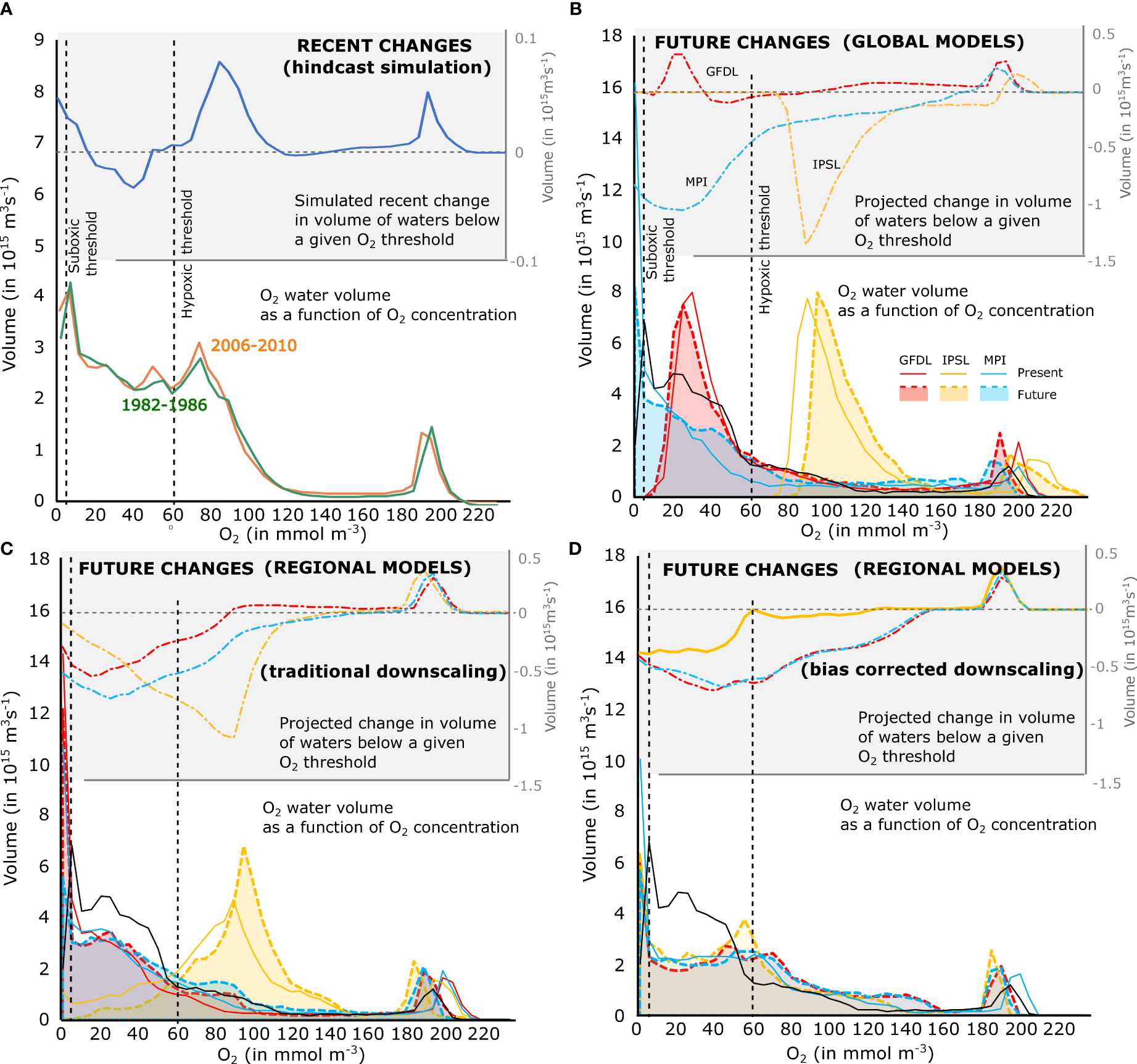 Recent and future changes in O2 frequency distribution in the Arabian Sea. (A) O2 frequency distribution in the Arabian Sea as simulated in the early 1980s (green) and the late 2000s (orange) as well as the cumulative frequency of simulated O2 change over the 1982-2010 period (blue, right axis) from (Lachkar et al., 2021). Note the expansion of poorly oxygenated waters (O2 < 100 mmol m-3) as well as waters with extreme O2 depletion (O2 < 10 mmol m-3). (B–D) O2 frequency distribution in the Arabian Sea in the present-day (solid line) and in the future (dashed filled area) as well as cumulative frequency of future O2 change (dash-dotted line, right axis) as simulated by (B) three global models (MPI, GFDL and IPSL) and a regional model (ROMS) forced with the three global models using traditional (C) and bias-corrected (D) downscaling approaches. Traditional downscaling consists in forcing the regional model with boundary conditions simulated by the global model, whereas bias-corrected downscaling (also known as pseudo global warming) consists in constructing regional model lateral boundary conditions by adding global model projected changes onto observational data. (B–D) Note the reduction in model discrepancies in future O2 projections in the downscaled experiments, particularly when using the bias-correction approach, relative to the global simulations. Adapted from Vallivattathillam et al. (in review).