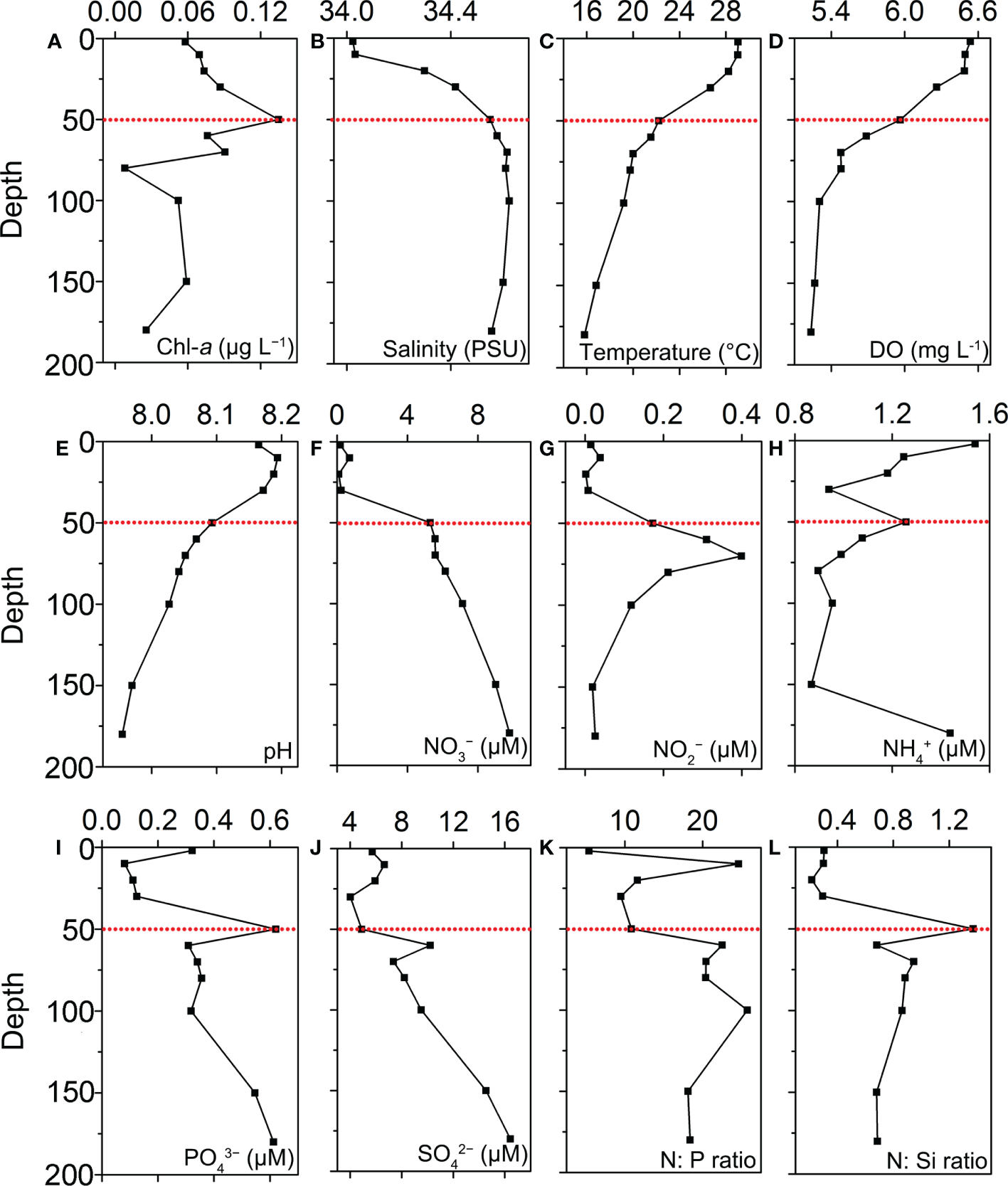 Vertical profiles of chemical and physical parameters in station B6: (A) total Chl-a concentration; (B) Salinity; (C) Temperature; (D) Dissolved oxygen; (E) pH; (F) NO3−; (G) NO2−; (H) NH4+; (I) PO43−; (J) SiO42−; (K) N:P ratio; (L) N:Si ratio.