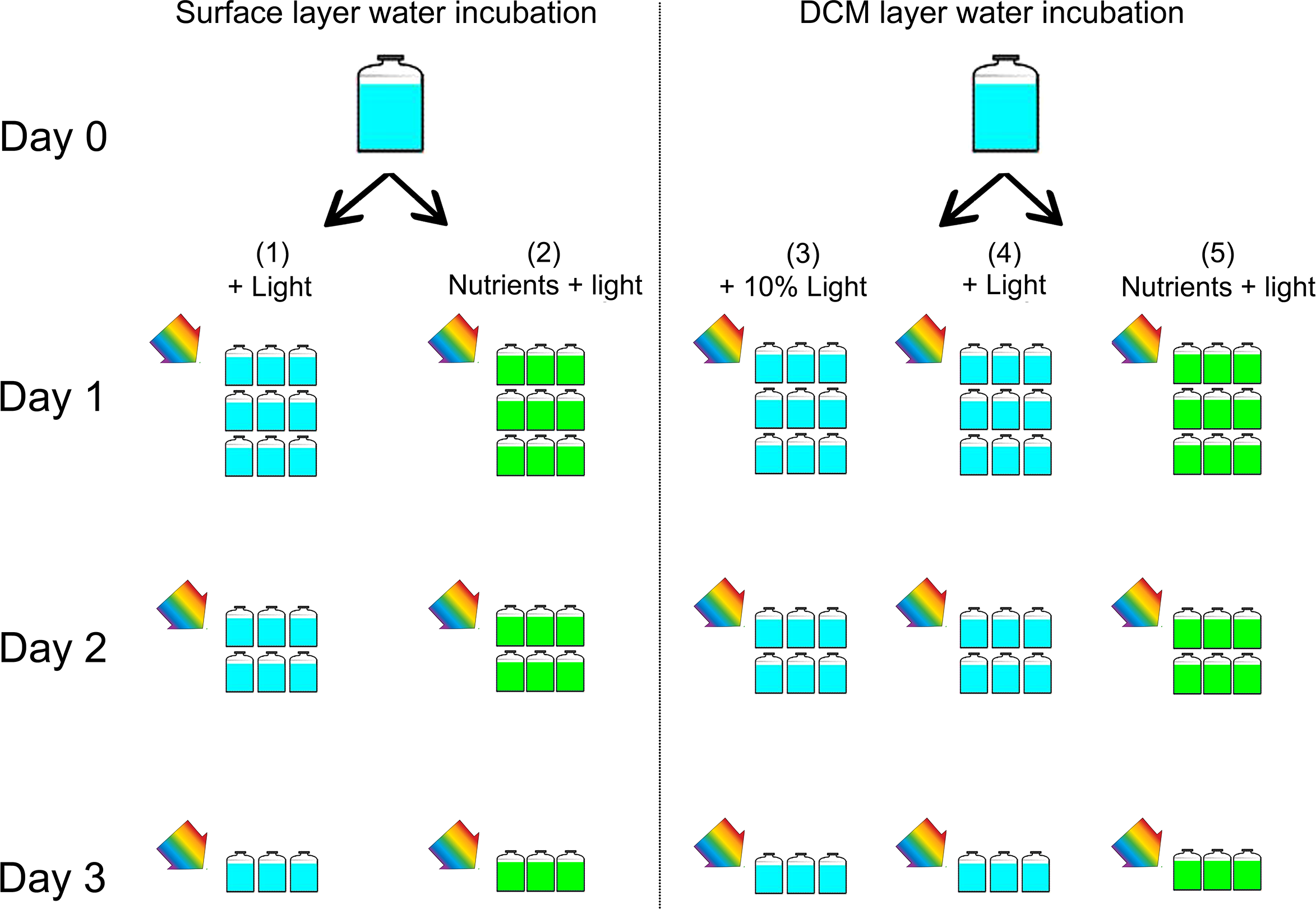 The water samples of the surface layer (1 m) and the DCM layer (50 m) at station B6 were pre-filtered through 200 μm nylon mesh to remove large zooplankton and debris, then dispensed into 45 acid-cleaned 2 L plastic bottles (totally 5 groups, 9 bottles per group). The experiment was designed in 5 treatments (groups) shown as Figure 3. For surface water, treatment (1) is Control: water sample + natural light; (2) water sample + nutrients + natural light. For the DCM layer water, treatment (3) is Control: water sample + 10% light; (4) DCM layer water + natural light; (5) DCM layer water + nutrients + natural light.