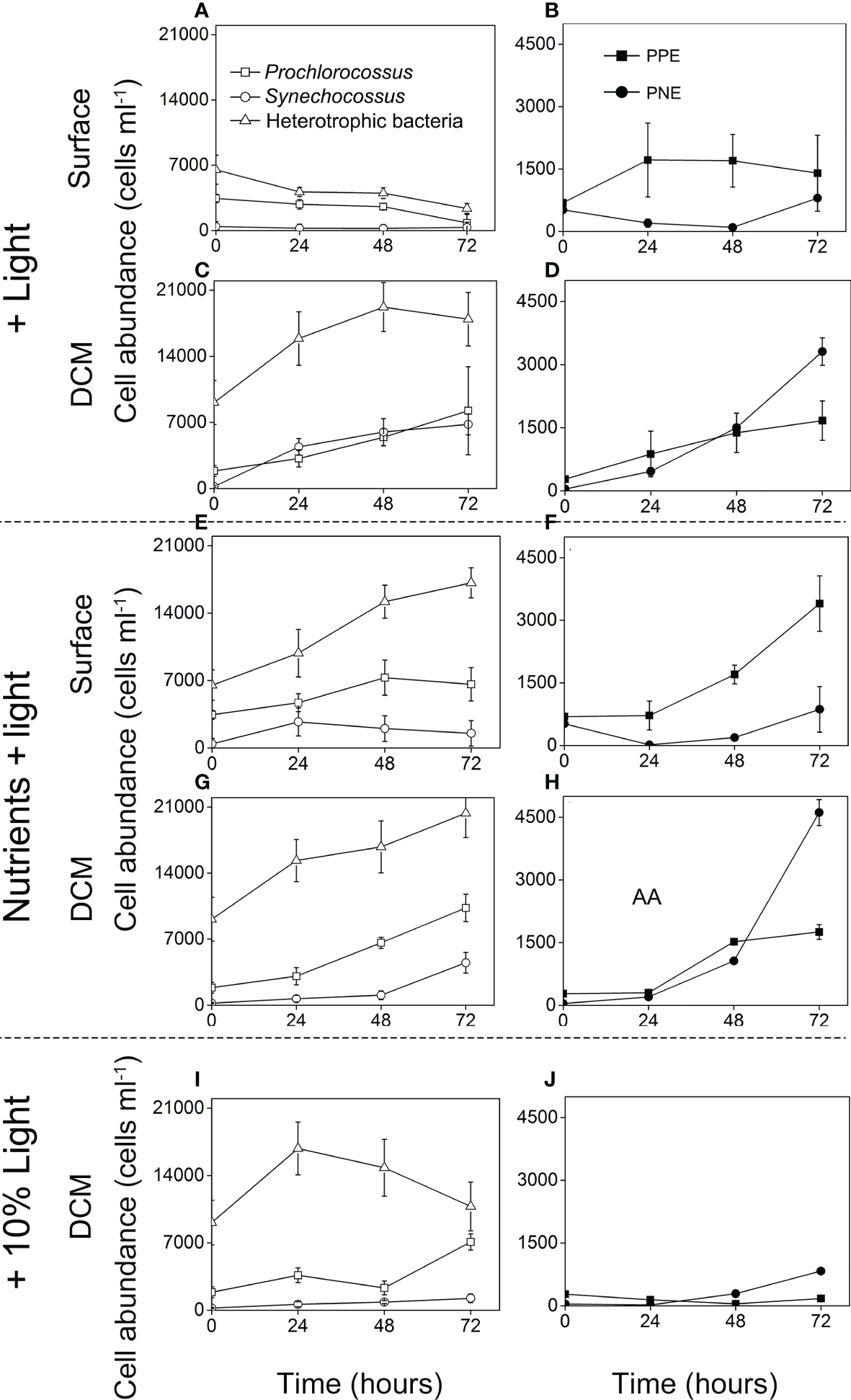 Time course of cell abundance of heterotrophic bacteria, Cyanobacteria (Prochlorococcus and Synechococcus), PPE (photosynthetic pico-eukaryotes) and PNE (photosynthetic nano-eukaryotes) during the field incubation experiments: the + light groups (A–D), the + nutrients + light groups (E–H), the + 10% light group (I–J).