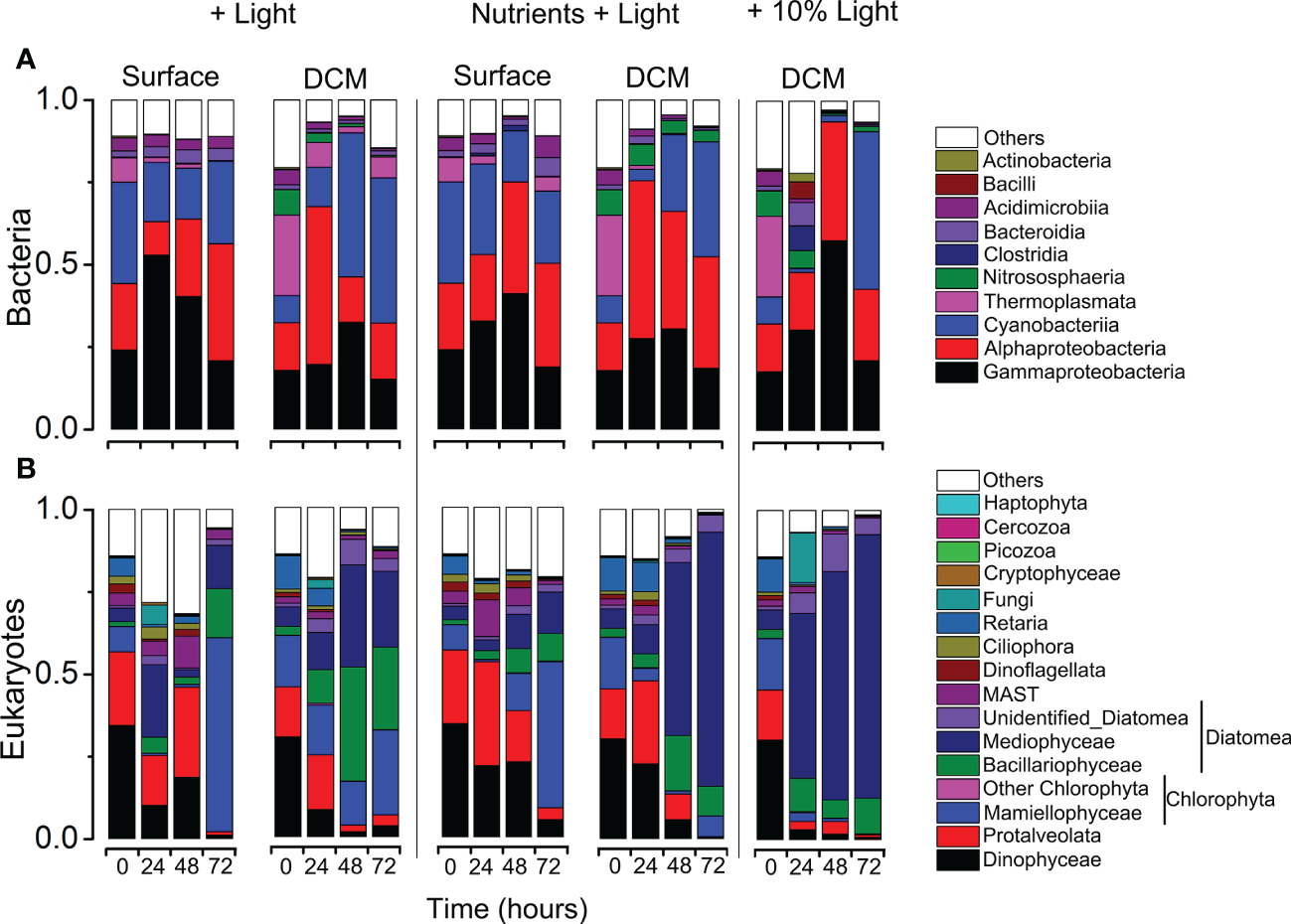 A total of 25 bacterial phyla were detected in the incubation experiments. The relative abundance varied greatly, ranging from 15.15 to 57.59% for Gammaproteobacteria, 10.15%–48.00% for Alphaproteobacteria, 1.18%–47.86% for Cyanobacteriia, 0.01%–24.45% for Thermoplasmata. Bacteroidia were less abundant (0.42%–7.10%), Acidimicrobiia (0.30%–6.43%), Bacilli (0.03–5.16%), Actinobacteria (0.02–2.51%) and others were relatively minor components of the communities (Figure 6A). In case of eukaryotes (Figure 6B), overall, the community of eukaryotes was dominated by Diatomea (4.89–95.85%) with Chlorophyta being 0.27–64.45%, Dinophyceae 0.30–34.36%, Protalveolata 0.29–31.56%, MASTs 0.31–11.37%.