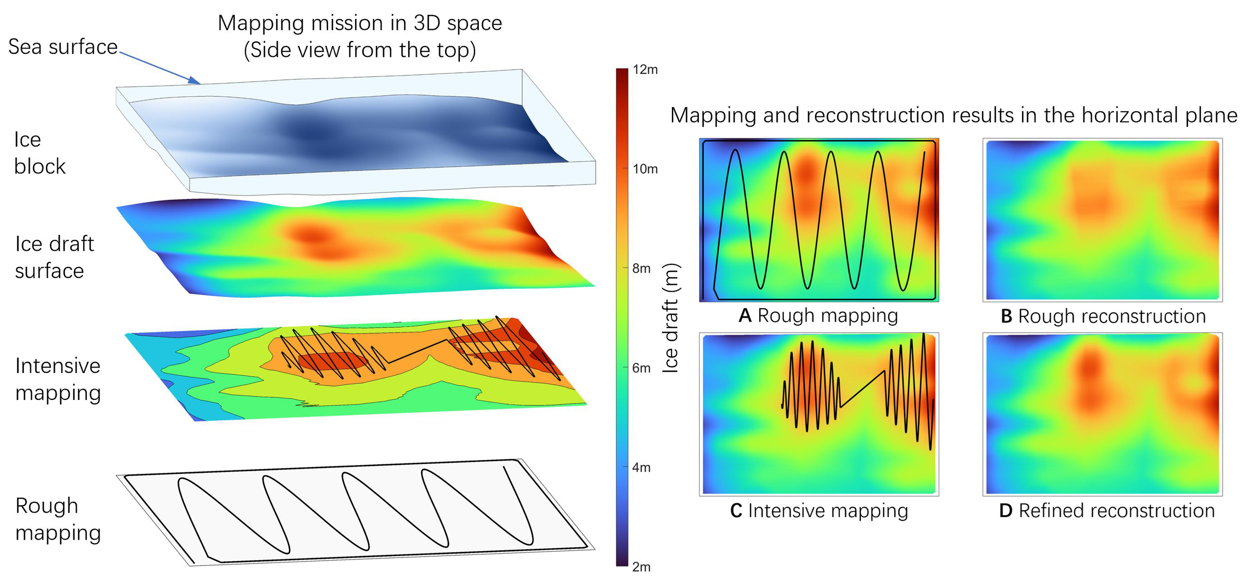 Framework for underwater ice adaptive mapping and reconstruction. The mapping and reconstruction results are shown in the right subplots: (A) Rough mapping, (B) Rough reconstruction, (C) Intensive mapping, and (D) Refined reconstruction.