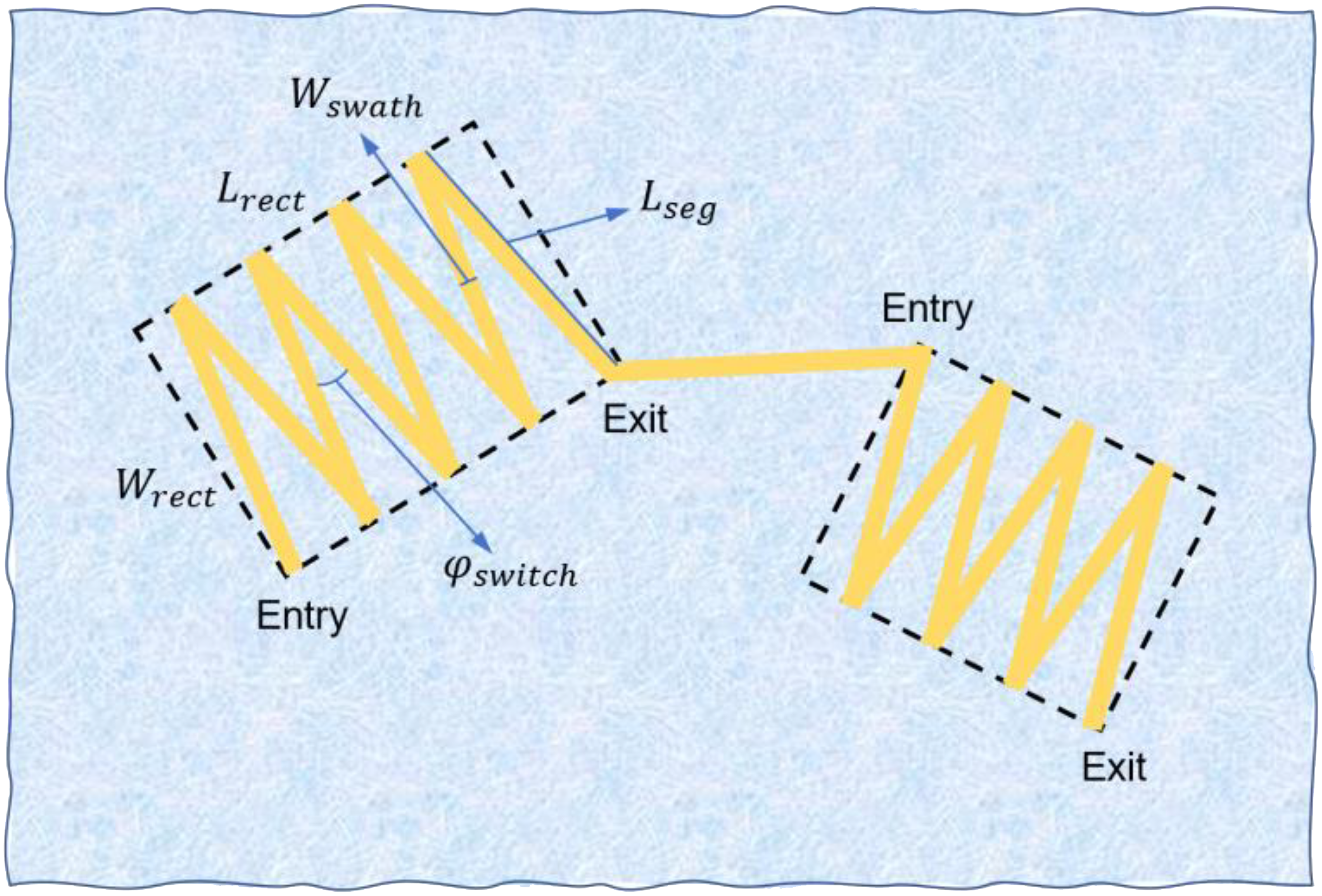 where Lrect and Wrect are respectively the length and width of the extracted rectangular region; Wswath indicates the swath width of the single-beam sonar; Nseg is the segment number of the zig-zag trajectory within one rectangle; and Lseg is the length of each segment in zig-zag trajectories and can be calculated by the following expression: