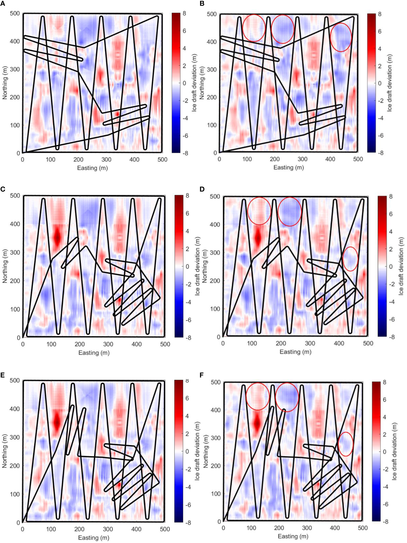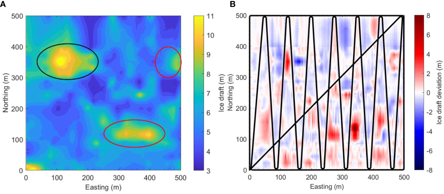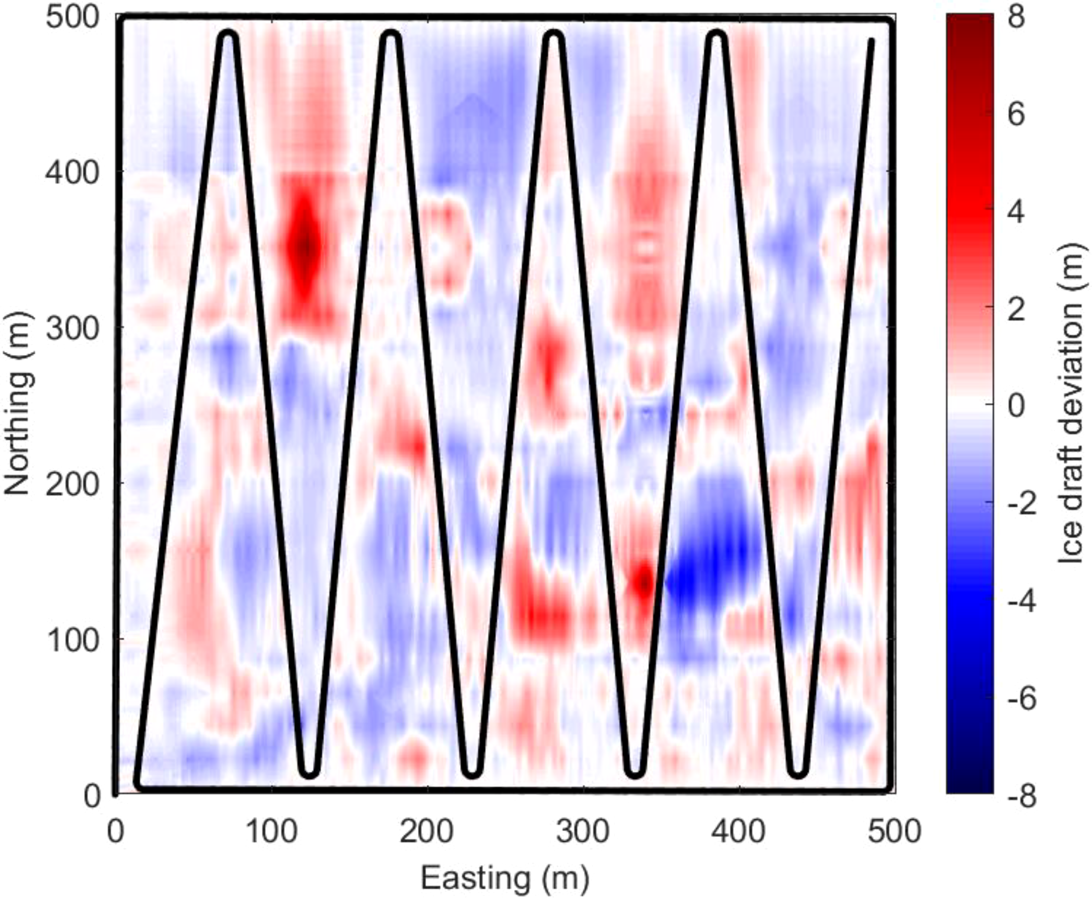 Given the endurance limitation of the vehicle, and also for safety consideration, the total mapping area is usually divided into several blocks in the real mapping mission; the vehicle will map each block one by one. To make the mission controllable, the mapping area of each block is set as 500m×500m in our study. The selection of this scale is reasonable because the sea ice draft measurements within this range are fine enough to calibrate the estimated sea ice draft using satellite remote sensing image, such as MODIS data with a pixel size of 250m.