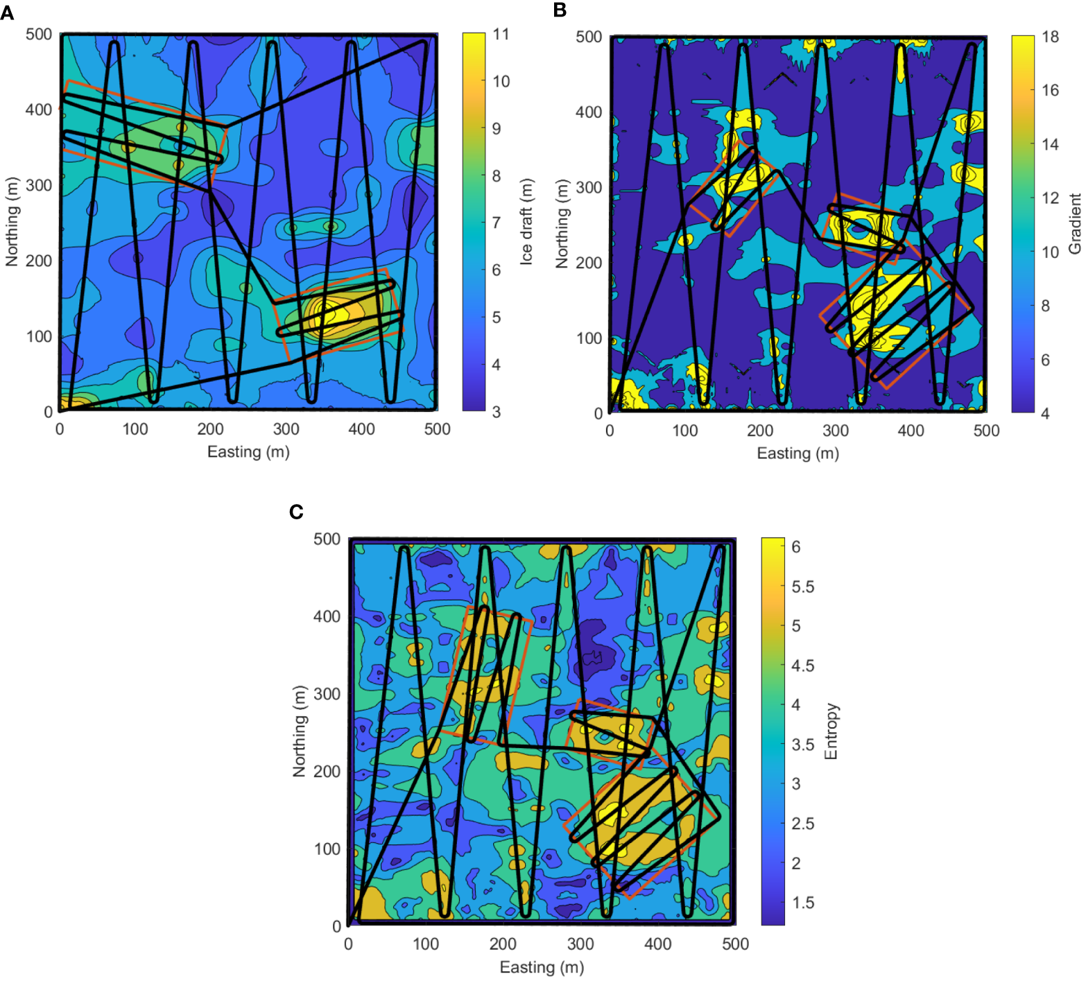 To identify the regions of interest autonomously from the roughly reconstructed ice map, we need to define the identification rules quantitatively. As we mentioned before, the interested regions are the areas that present remarkable topographic variations; here, we propose three criteria to identify those regions: the ice draft, the ice draft gradient, and the ice draft entropy methods.