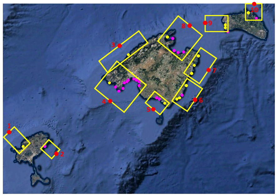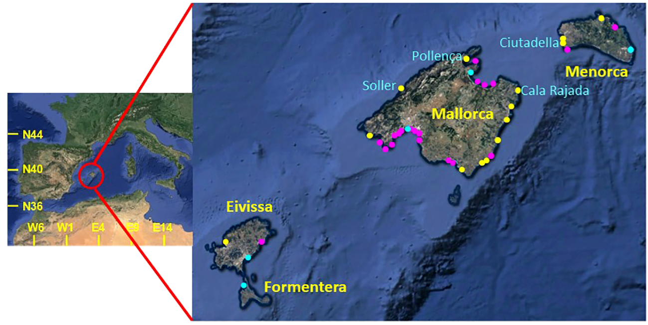 The study area corresponds to the Balearic Islands (western Mediterranean Sea, from 38°38’N to 40°06’N and from 1°09’E to 4°20’E). These islands form an archipelago (Figure 1) with four major islands (Mallorca, Menorca, Eivissa and Formentera) and several islets.