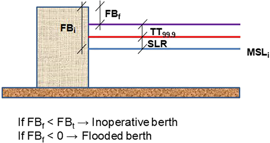 Sketch showing the inoperability or flooding of berthing structures. FBi, initial freeboard; FBf, final freeboard; FBt, threshold freeboard; MSLi, initial mean sea level; SLR, sea level rise due to climate change; TT99.9, 99.9 percentile of the level resulting from combining tide and storm surge (including changes in storm surge due to climate change).