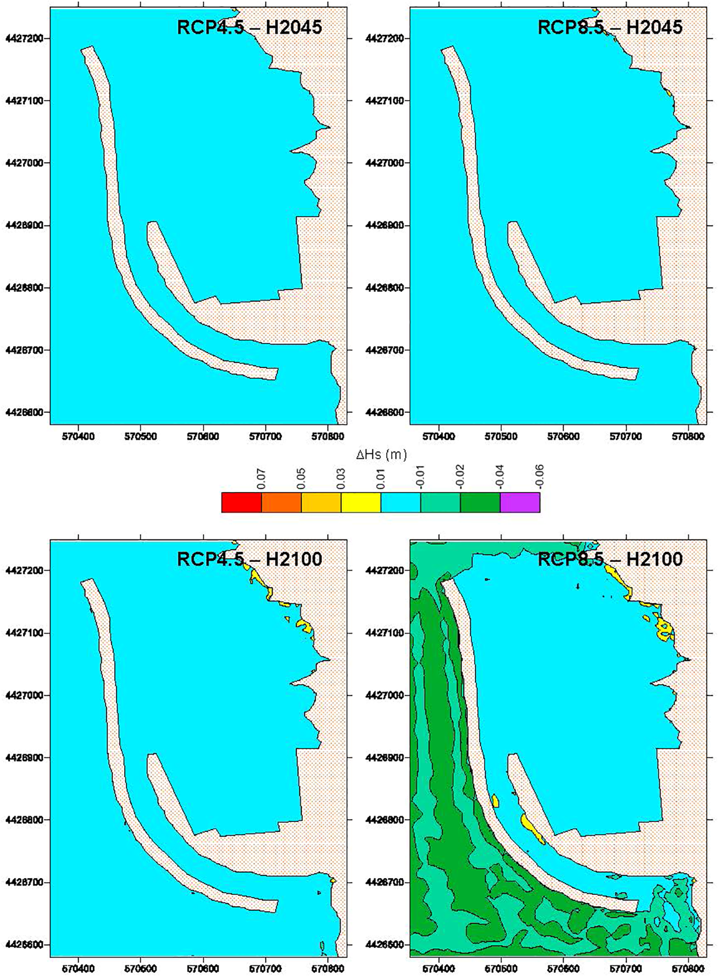 For comparative purposes, the annual average Hs was computed at each point of the port grids for the present situation and the four future scenarios. This was done (for each scenario) by multiplying the Hs obtained at each node in each numerical simulation by the frequency of presentation of the wave conditions simulated and making the addition of the values corresponding to all simulations at each node. It must be pointed out that, in future scenarios, the water depth at each grid point was increased by the corresponding value of climatic SLR.