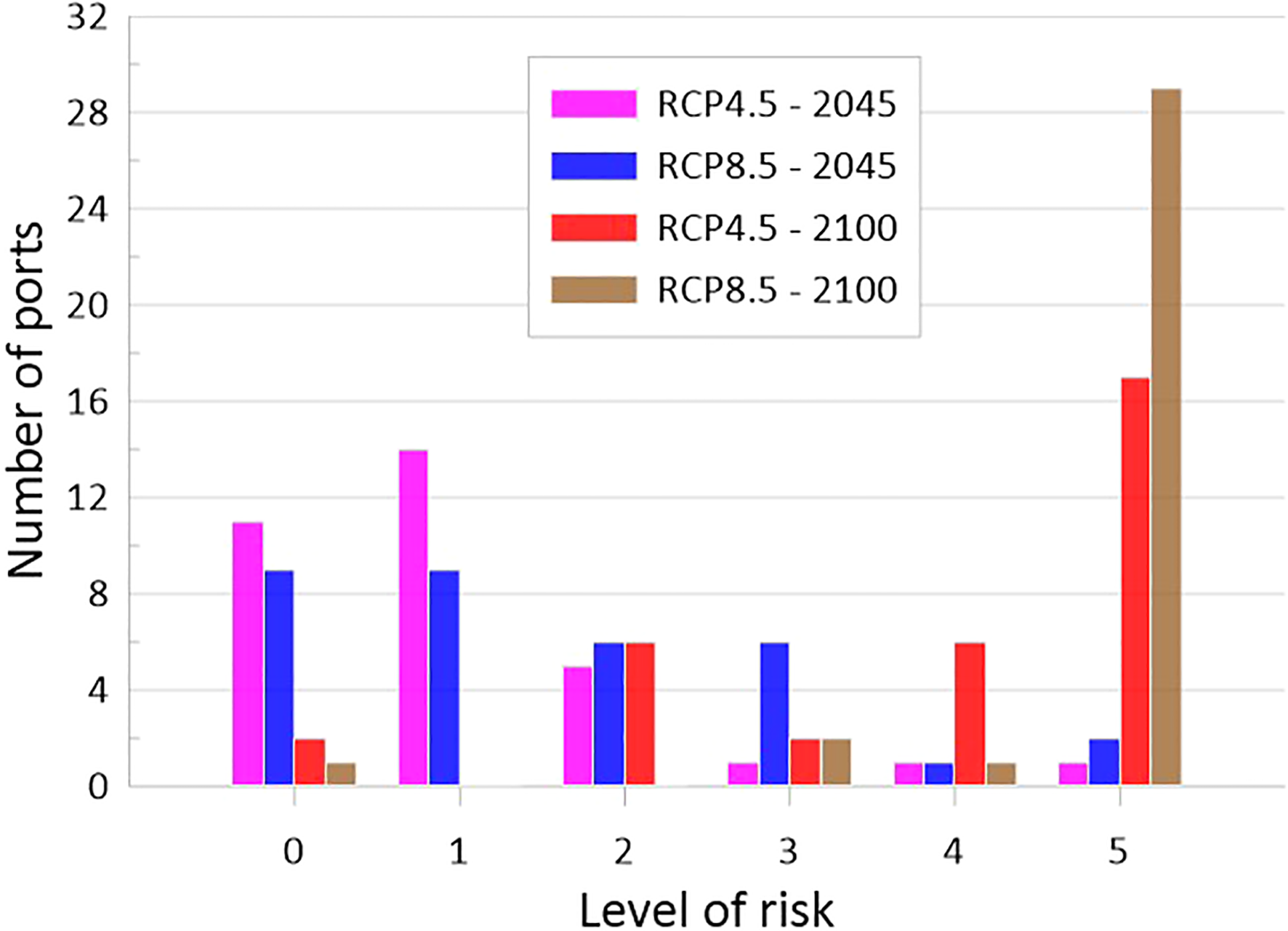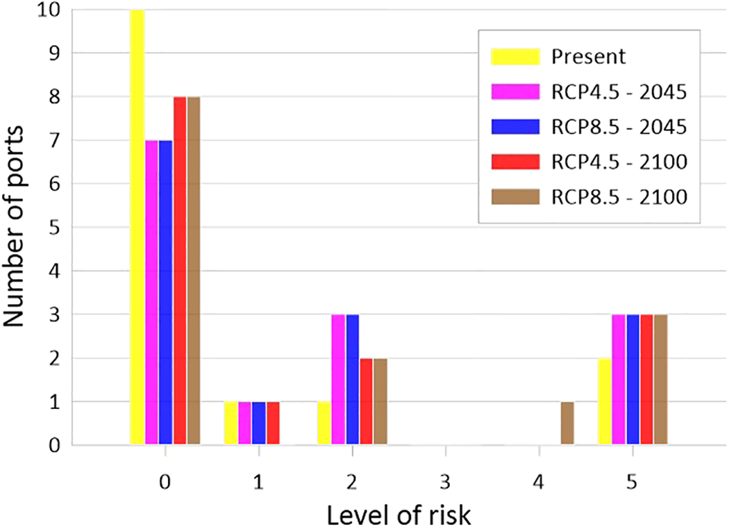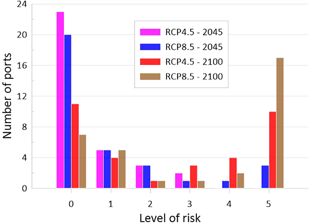 In Figure 9 the distribution of risk levels due to insufficient freeboard in docks under different scenarios is shown. In this figure, a clear increase of risk levels associated to greater SLR can be observed. In particular, in horizon 2100 for both scenarios, such an increase becomes clearly apparent, with 17 (RCP4.5) and 29 (RCP8.5) ports attaining the maximum level of risk.