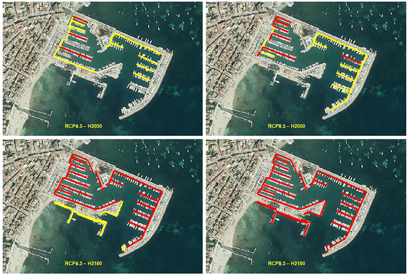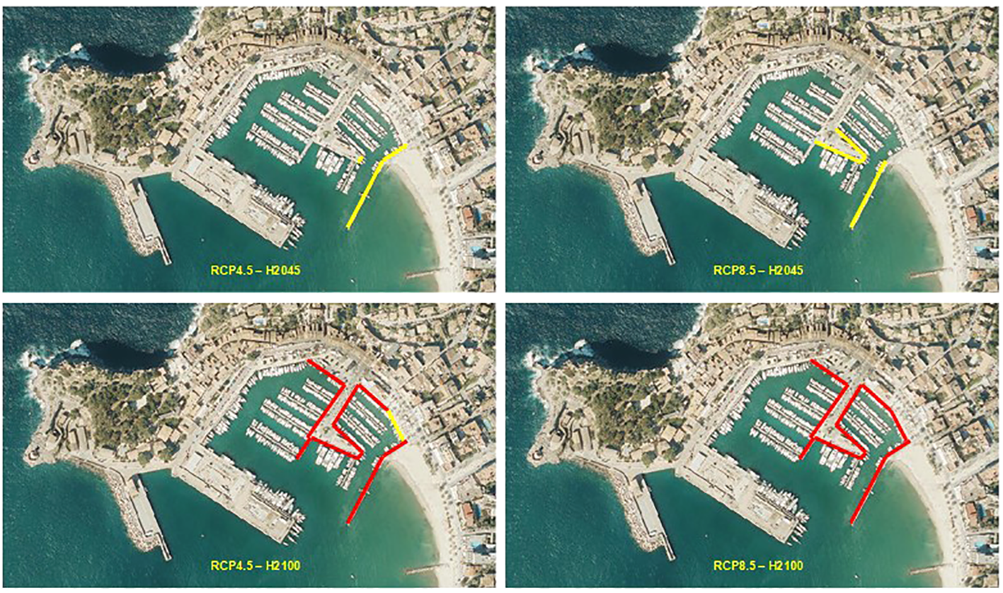 To illustrate the impact of SLR on dock and pier inoperability due to insufficient freeboard, Figure 7 shows the evolution, under future scenarios, of Soller harbour, a port in which most of the piers are floating. Such type of piers can be easily adapted to SLR, so that they remain operative whatever the value of SLR. In this and next figures, we distinguish between structures with insufficient freeboard (marked in yellow) and those that eventually (depending on the conditions of tide and storm surge) can be flooded (marked in red). Notice that in the port shown in Figure 7, besides the floating piers, most of the docks have enough freeboard for not losing operability due to SLR, being an example of a port barely affected by the climatic SLR. As a consequence, its level of risk is not high in the different scenarios being, in the case of docks, very low in 2045 (for both climatic scenarios) and medium in 2100 (also for both scenarios). In the case of piers, for both scenarios, the levels of risk are very low in 2045 and low in 2100.