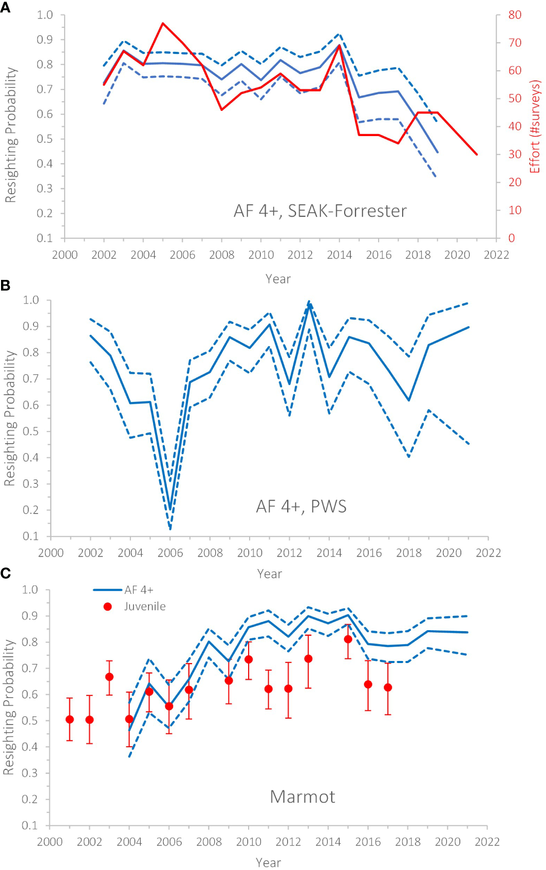 Annual resighting probabilities (May–August) of Steller sea lions in the Gulf of Alaska 2001–2021, by age-class and natal rookery. (A) Forrester Islands, Southeast Alaska; (B) Prince William Sound; (C) Marmot Island, see Figure 1). AF 4+, adult females 4+ years of age; SEAK, Southeast Alaska; PWS, Prince William Sound. Juvenile, < age 4. Error bars/dashed lines are 95% CI. Annual survey effort (red in a) = number of unique surveys (date*time*site) conducted per year during summer boat-based resighting trips in SEAK (excluding sites at Forrester Island Complex where a field camp was conducted).