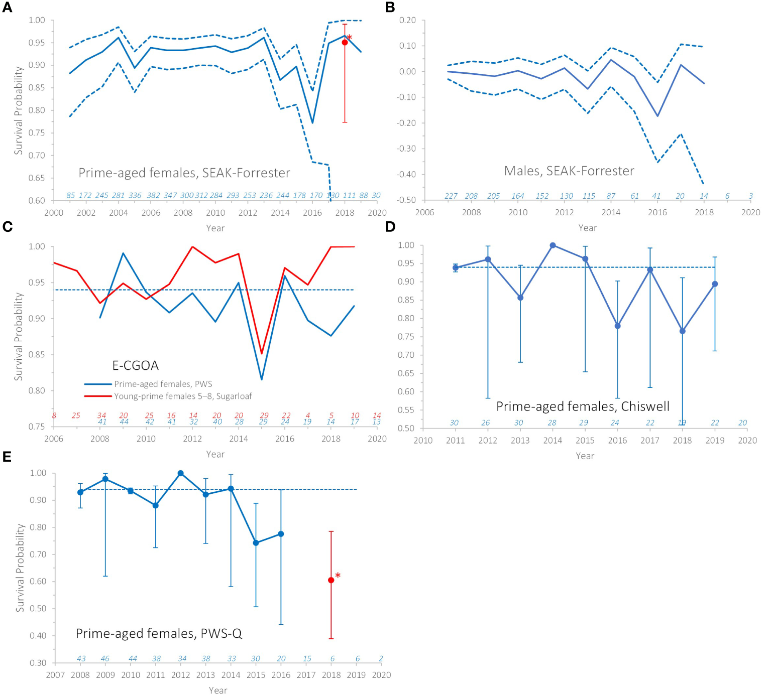 Annual survival probabilities of Steller sea lions by age-sex class and natal rookery. (A, B, Forrester Islands; C, Prince William Sound and Sugarloaf; D, Chiswell Island; E, dive-captured animals in Prince William Sound; see Figure 1). Annual intervals over which survival was estimated are indicated on the x-axis by the start of the interval, e.g., 2015= summer 2015 to summer 2016. Models with full year-specific estimates were not supported but were examined to verify that years of poor survival after 2013 also appeared anomalous within the series. Prime-aged females = age 3–15, for which survival was best modeled as constant with age (see Supplemental Figures 1, 3 for age-specific patterns). Young-prime females were age 5–8. SEAK, Southeast Alaska; E–CGOA, eastern–central Gulf of Alaska; PWS, Prince William Sound. Error bars/dashed lines are 95% CI. In (C–E), dotted lines = the average value across years (0.94). Only point estimates in (C) are shown because precision of annual estimates was poor. Numbers just above the x-axis are sample sizes of that group observed in that year. Average estimates from 2017–2019 in (A, E) are in red with *. Annual variation in (B) is plotted as the difference from the 2007 estimate for a single age-class.