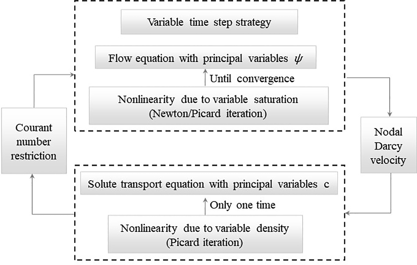 A modified Galerkin finite element method was applied to solve the flow and transport equations of the model (Kees et al., 2008; Choo, 2018). Additionally, backward Euler scheme with variable time steps strategy was employed, which has been demonstrated to be effective in the case of wet-dry soil (Zha et al., 2017). The modified Picard method enable the use of large time step, resulting in significantly improves computational efficiency (Celia et al., 1990). At each time step, the flow equation is iterated using the Newton/Picard scheme until convergence, whereas the transport equation is iterated only once using the Picard scheme. The spatial distribution of the solutes was gradually corrected through flow calculations. This avoids non-convergence behaviour for solving transport equations and saves considerable CPU and computational memory. The detail iteration is shown in Figure 1.