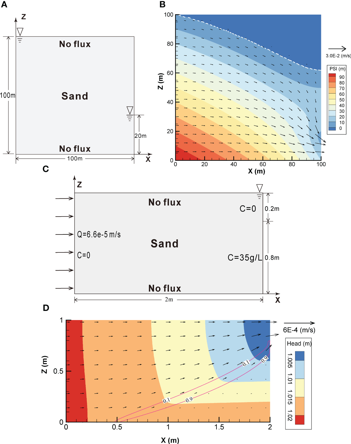 Schematic descriptions of the (A) typical soil seepage and (C) modified Henry problems, and their flow fields, (B) and (D), respectively, following stabilisation. The white dashed line represents the boundary between the saturated and unsaturated zones, while the red solid line represents the contour lines of salinity, as indicated throughout.