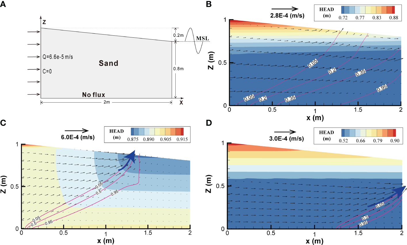 The simulated results in Figure 3B show that after mixing with freshwater, seawater is discharged into the ocean from the upper-right boundary, with an intrusion distance of up to 1.2 m. The simulation stabilized after 5 h, generating a salt wedge in the lower-right corner. The entire area had a head distribution ranging from 0.80 to 0.82 m, small hydraulic gradient, slow flow velocity, and a submarine groundwater discharge (SGD) of 5.75×10–5 m2/s.