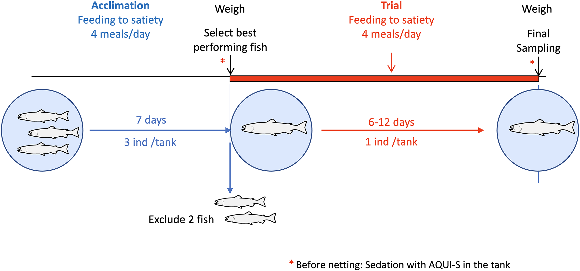 The fish were acclimated towards a solitary tank-based condition as follows (Figure 1): Atlantic salmon post smolts from the same broodstock (NLA strain, 0+) were measured for fork length and weight and were randomly distributed into the tanks (3 fish per tank) and were handfed until a regular feed intake in all fish was observed (7 days). The 3 individuals from each tank were lightly anesthetised with 12 mgL-1 Aqui-S (New Zealand), netted and the weight and fork length registered. One of the three individuals in each tank was selected for the study based on best performance (growth) during the 7-day acclimation period. The selected individual was carefully returned to the tank for the trial. All the selected individuals resumed feeding a few hours after they were returned to their tanks.