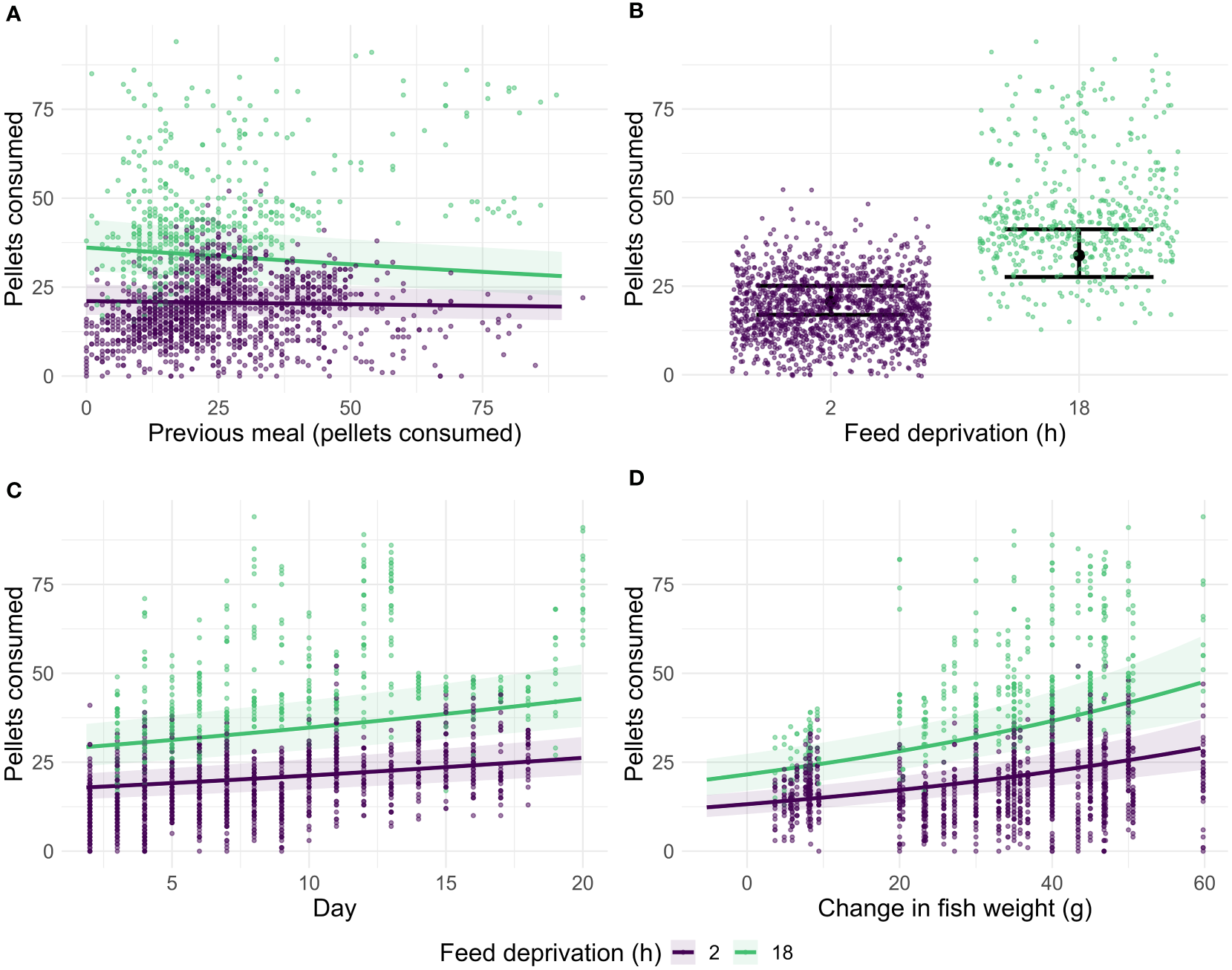 Number of pellets consumed in relation to pellets consumed in previous meal and the feed deprivation time, 2 or ≥18 h (A), number of pellets consumed in relation to feed deprivation time (B), number of pellets consumed in relation to the day of experiment and feed deprivation time (C), and number of pellets consumed in relation to the fish weight change (final minus initial weight) and feed deprivation time (D). Lines and shaded areas show effect and 95% confidence intervals of each variable predicted by a linear mixed effect model, dots represent measurements by fish, meal, and feed deprivation time (colours).