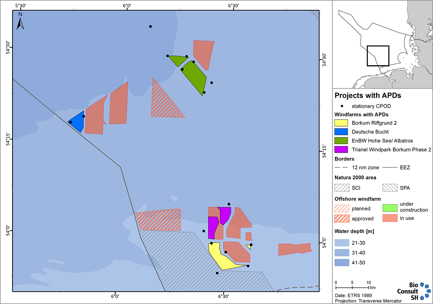 The harbor porpoise (Phocoena phocoena L., 1758) is the most common cetacean in the continental shelf waters of north-western Europe (Hammond et al., 2013; Hammond et al., 2017). An estimated 345,000 animals live in the North Sea (Hammond et al., 2017). The German Bight, where all offshore wind farms considered in this study are located, is known to be a region of relatively high porpoise density (Gilles et al., 2009; Peschko et al., 2016).