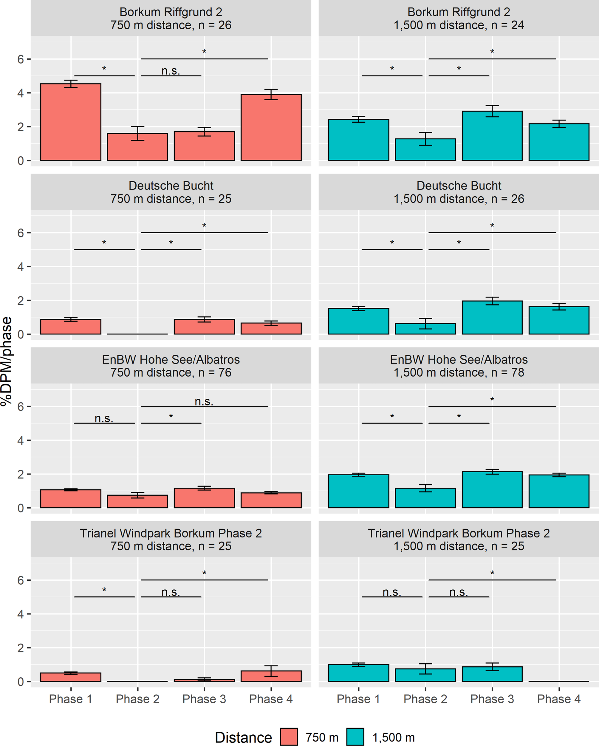 At a short range (distances 750 m resp. 1,500 m), the detection rate %DPM/phase was low in general, mostly highest during Phase 1 (before APD operation) and lowest for Phase 2 (during APD operation) (Figure 2). Depending on the wind farm, detection rates decreased by 30 to 100% at 750 m distance and by 25 to 60% at 1,500 m distance when the APD was switched on. This decrease was significant in 750 m and 1,500 m distance for all wind farms except for EnBW Hohe See/Albatross at 750 m distance and Trianel Windpark Borkum Phase 2 at 1,500 m distance. During Phase 3 (during piling), detection rates inclined again, and increased further during Phase 4 (after piling). Depending on the wind farm, detection rates during Phase 4 increased again to 75 to 125% of the level of Phase 1 at 750 m distance and 89 to 107% at 1,500 m distance (exception: 0%DPM/phase in Phase 4 at wind farm Trianel Windpark Borkum Phase 2 at 1,500 m distance).