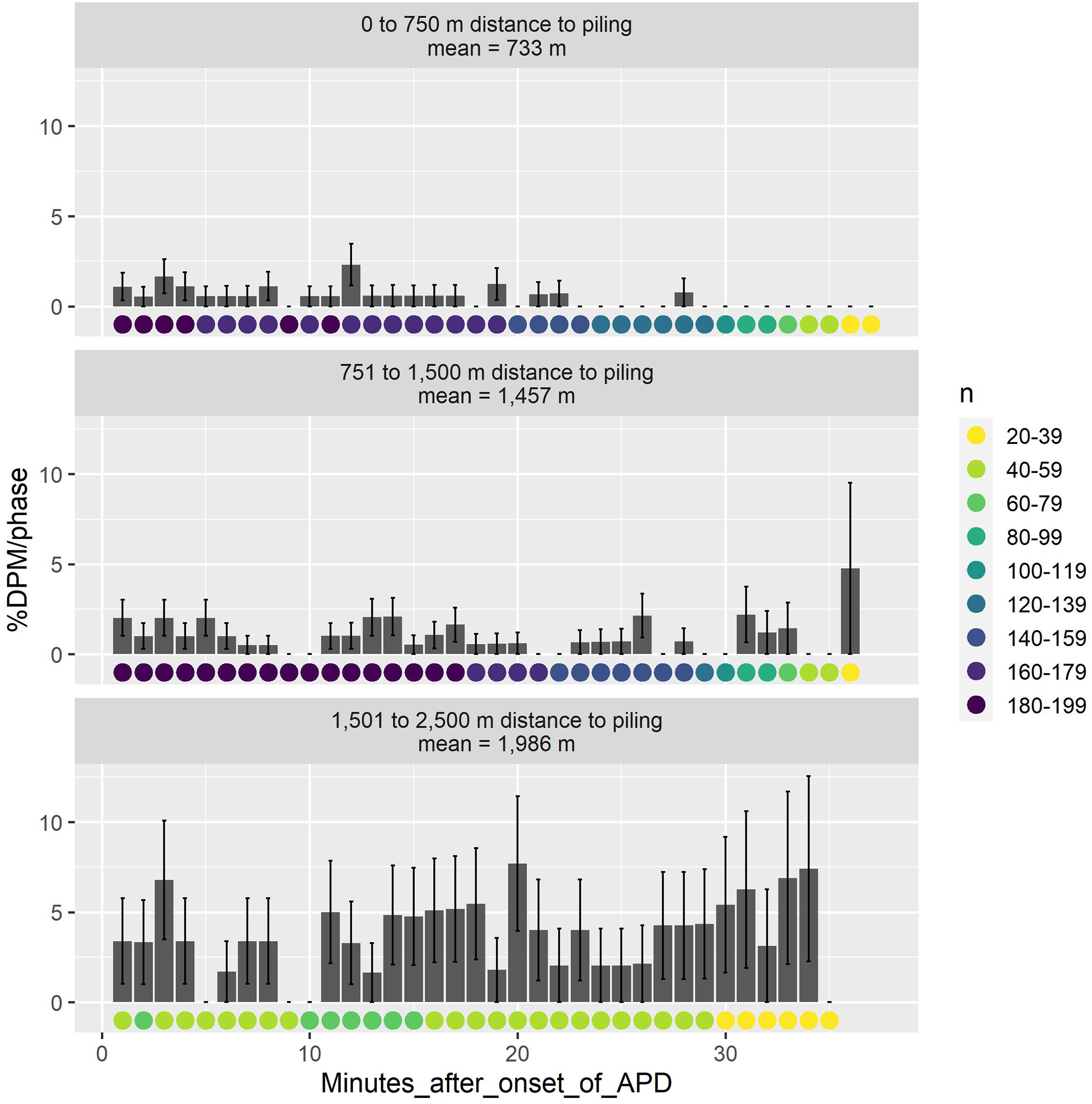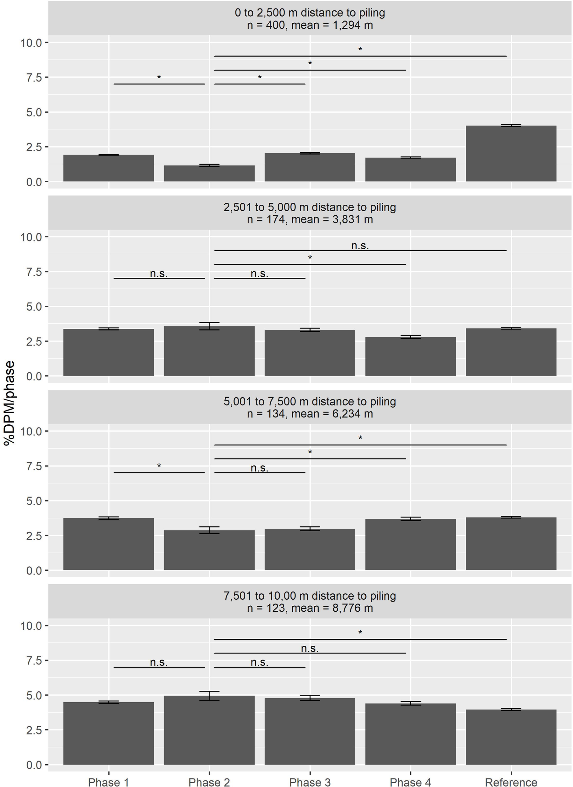 At distances up to 2,500 m from piling locations, values of %DPM/phase were highest during the phase Reference and lowest during Phase 2 (Figure 5). Namely, detection rates decreased by 52% from phase Reference to Phase 1 and by a further 40% from Phase 1 to Phase 2. In contrast, at distances from 2,501 to 5,000 m, detection rates were similar among the individual phases and no significant difference was observed between Phase 2 and Reference. At distances between 5,001 and 7,500 m, in contrast, the detection rate was significantly lower in Phase 2 compared to Reference. At distances between 7,501 and 10,000 m, the detection rate was significantly higher in Phase 2 compared to Reference.