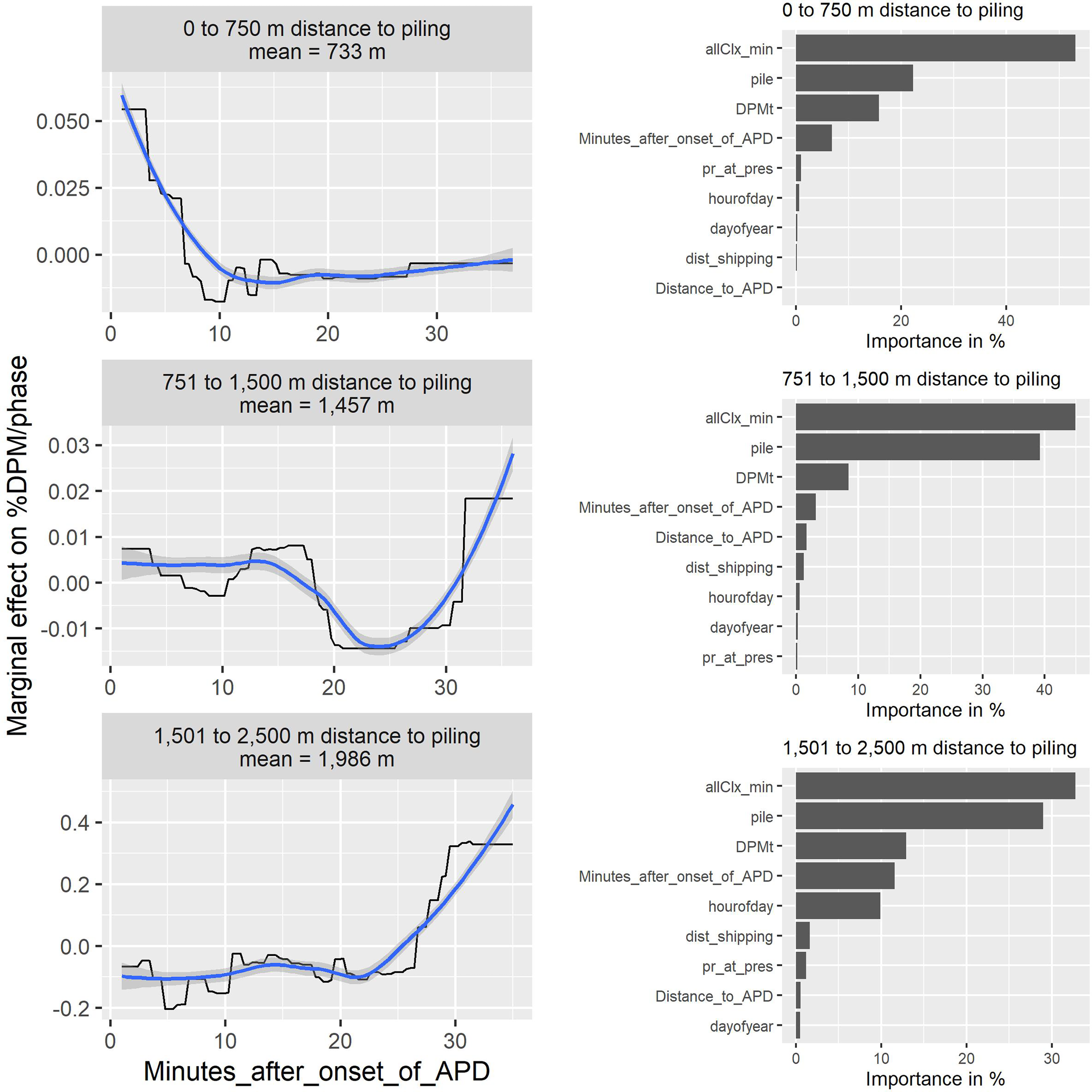 Left panels: Partial Dependence Plots (PDPs) of Boosted Regression Tree (BRT) models with covariates; response variable: %DPM/phase with ongoing APD operation in minutes (Minutes_after_onset_of_APD) for the distance classes 0-750, 751-1,500 and 1,50-2,500 m; y-axis: marginal effect of Minutes_after_onset_of_APD on %DPM/phase. Mean is the mean distance per distance class; the sample size n strongly decreases for minutes above 30, so data after this minute must be treated cautiously. Right panels: relative contribution of the considered variables to the respective boosted regression trees. Explanatory variables: allClx_min (number of all clicks within a minute), DPMt (DPM in previous minute), hourofday (hour of the day), dayofyear (day of the year), dist_shipping (distance to the next major shipping lane), and pr_at_pres (probability of presence of sand eel Ammodytes tobianus per station) and pile (ID of pile). Further explanations of these variables in Supplemental Table 1.