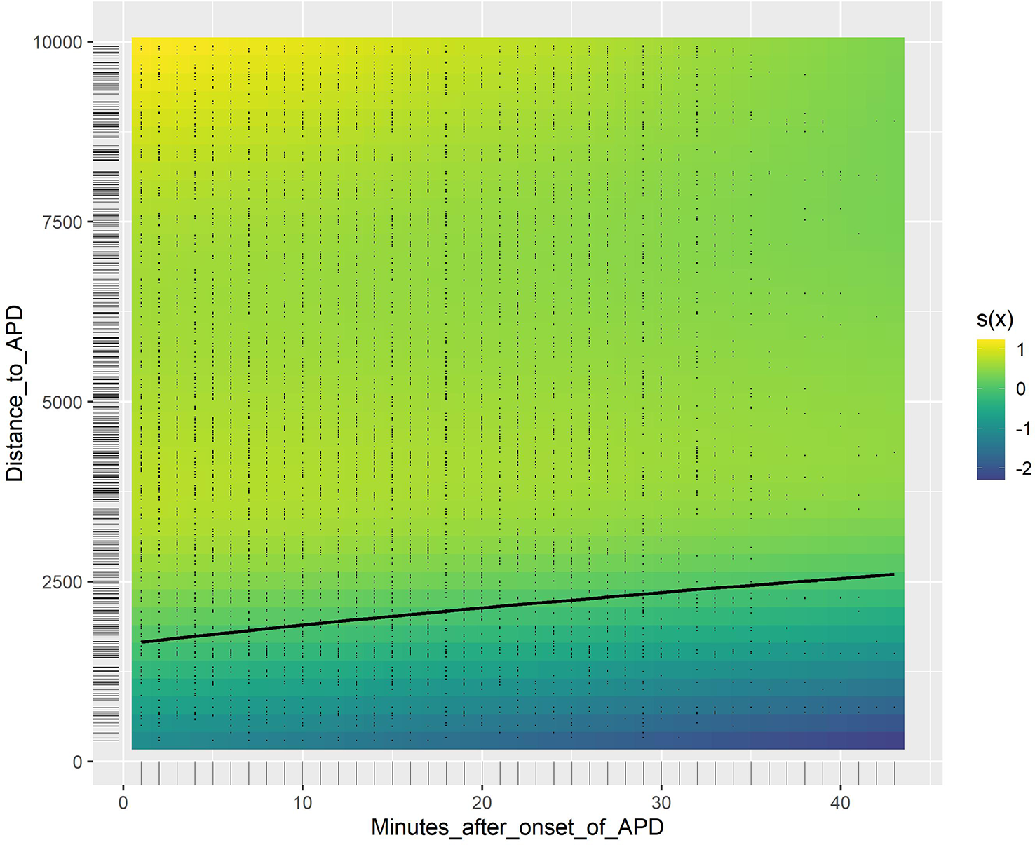 DPM served as the response variable (Supplemental Table 1). Explanatory variables of primary interest were the tensor product of the variables Minutes_after_onset_of_APD and Distance_to_APD, the latter describing the distance to the APD.