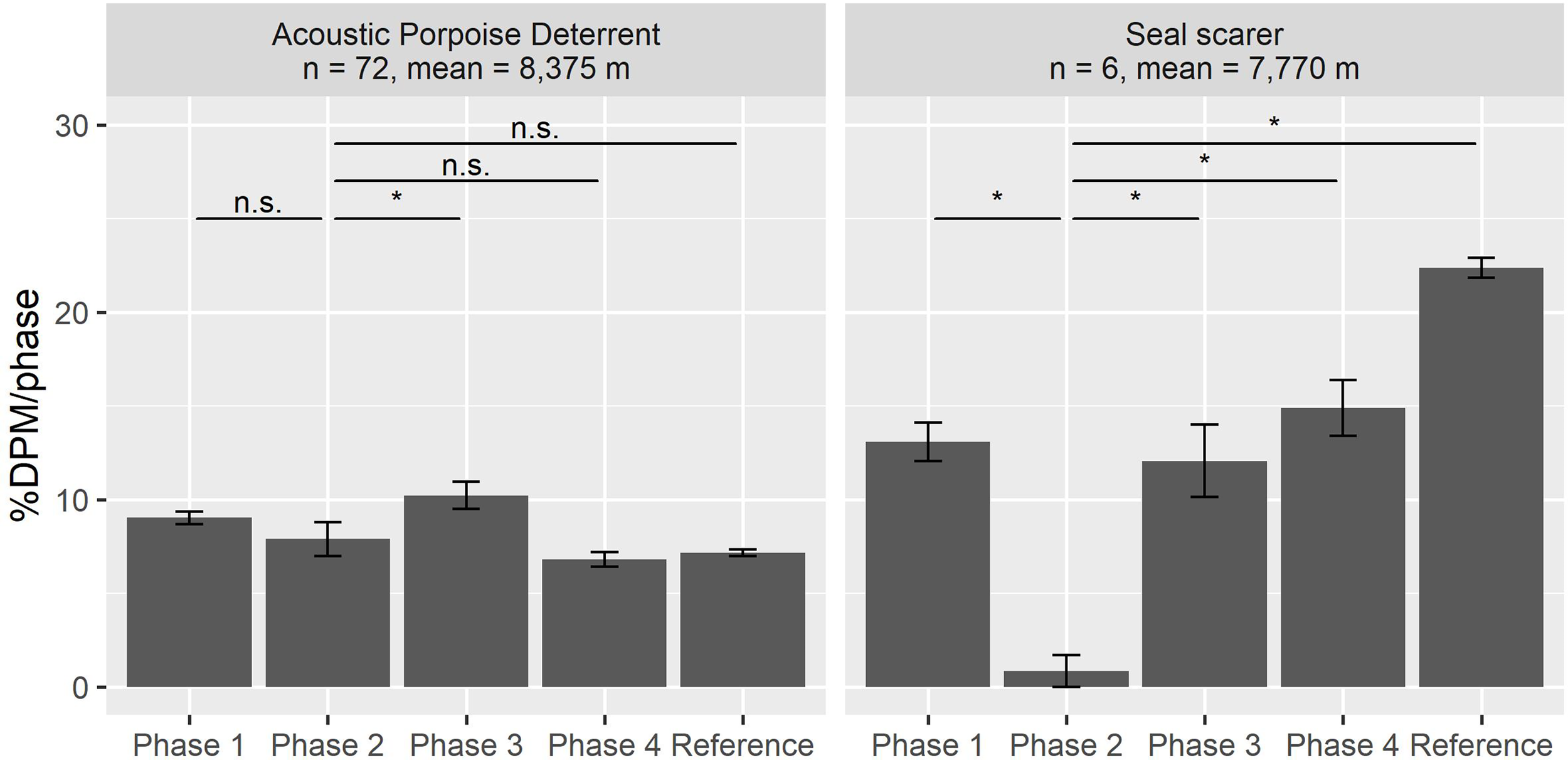 Comparison of effects during APD and seal scarer operation in the wind farm Trianel Windpark Borkum Phase 2 (mean and standard error of %DPM/phase in 5 to 10 km distance from pilings; n: number of analyzed POD/pile combinations). Black rhombuses show mean values, n is the number of analyzed POD/pile combinations, mean is the mean distance per distance class, and raw data are in Supplemental Table 7. A Bayesian proportion test showed a significant difference between the individual phases (test statistics in Supplemental Table 2); in this figure, the significance of the p-value between Phase 2 and the other phases is shown (Significance codes: [0] * [0.05] n. s. [0]).