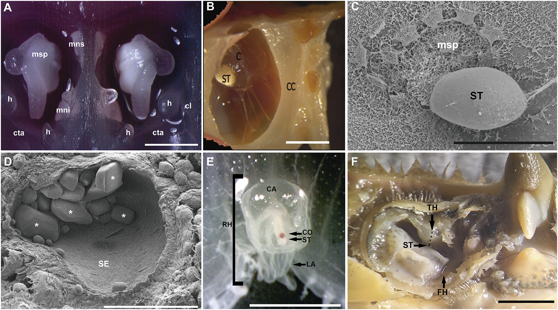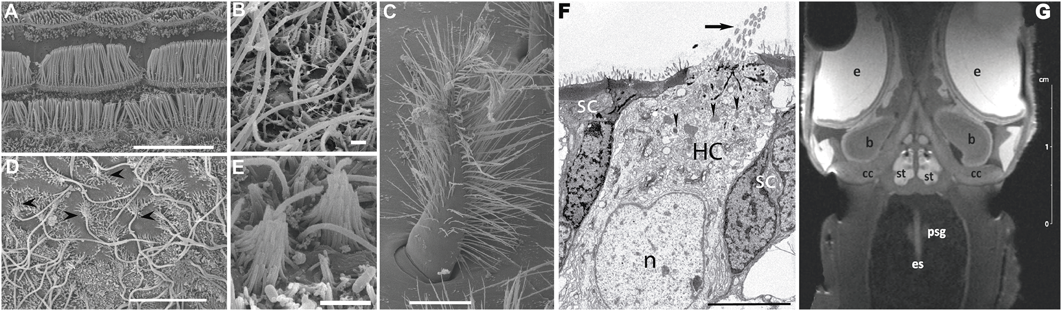 Imaging Techniques. (A–E): Scanning Electron Microscopy. (F): Transmission Electron Microscopy. (G): Magnetic Resonance Imaging. (A–F): Different types of sensory epithelia (hair cells) depending on the marine invertebrate group (A, F: Cephalopods. (B, E): Cnidarians. C: Crustaceans. D: Gastropods). (A): View of three rows of hair cells (bundle of kinocilia) in statocyst crista epithelium of Sepia officinalis. (B): Statocyst sensory epithelium of the jellyfish Cotylorhiza tuberculata. Hair cells carry an only nonmotile kinocilia surrounded by a short crown of stereocilia (Solé et al., 2016). (C): A seate (bearing hairs) of the medial group sensory epithelia in the hermit crab Dardanus calidus statocyst. Setae are typical hair cell on crustaceans. (D): Apple snail (Pomacea maculata) inner statocyst sensory epithelia. Arrowheads point to the hair cells exhibiting their lonely kinocilia surrounded by a crown of stereocilia. Between them microvilli of the supporting cells is visible (Solé et al., 2021a). (E): Statocyst sensory epithelia of the sea anemone Calliactis parasitica. Similarlly to other groups of cnidarians (B) their hair cells present a solitary kinocilia surrounded by a crown of stereocilia. (F): Apex of a S. officinalis hair cell (HC) in between two supporting cells (SC). The HC shows kinocilia (arrow), nucleus (n) and cytoplasmic mitochondria (arrowheads) (André et al., 2011). (G): Coronal view -anterior section- of squid (Loligo vulgaris) head (B: Brain, cc: cranial cartilage, e: eye, es: oesophagus, m: mouth, psg: posteror salivary gland, st: statocyst. (Solé et al., 2013b). Scale bar: (G) = 2 cm. (C) = 25 µm. (A) = 10 µm. (D, F) = 5 µm. (E) = 2 µm. (B) = 1 µm.