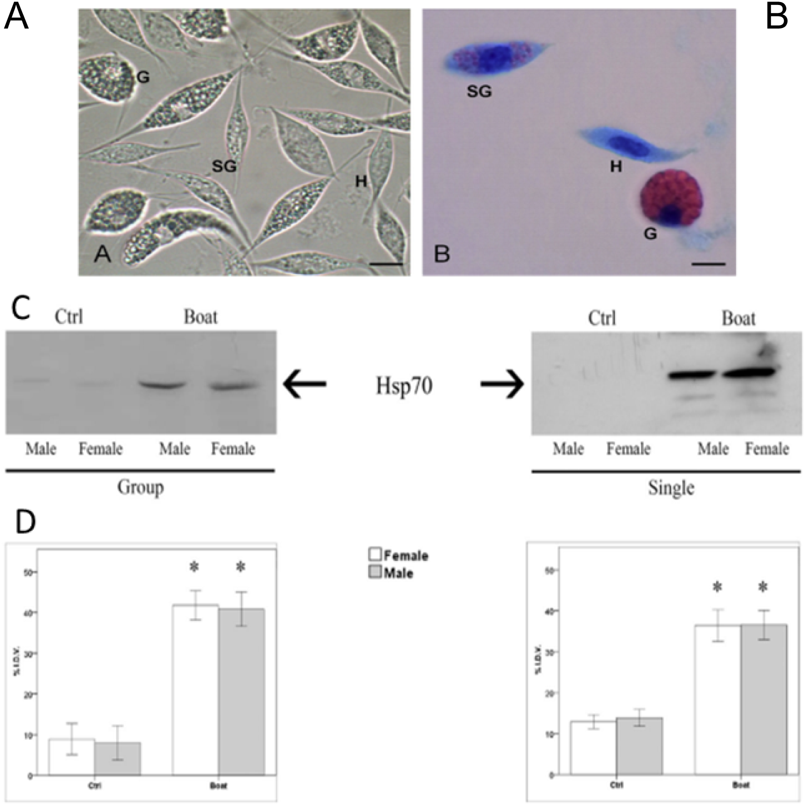 Light Microscopy. Haemocytes of the spiny lobster Palinurus elephas(A) no staining and (B) stained with May–Grünwald–Giemsa. H: hyalinocytes; SG: semigranulocytes; G: granulocytes. Scale bars: (A, B) = 8 µm. Effect of the acoustic stimuli on the expression levels of the protein Hsp70 in P. elephas; (C) Representative western blot of Hsp70 levels in single and grouped animals. (D) Integrated density value (% IDV) of the Hsp70 protein bands. Data are the means ± standard error (N = 18 control and N = 18 test specimens). Asterisks represent significant differences between CTRL and BOAT condition (*= p < 0.01). (Filiciotto et al., 2014).