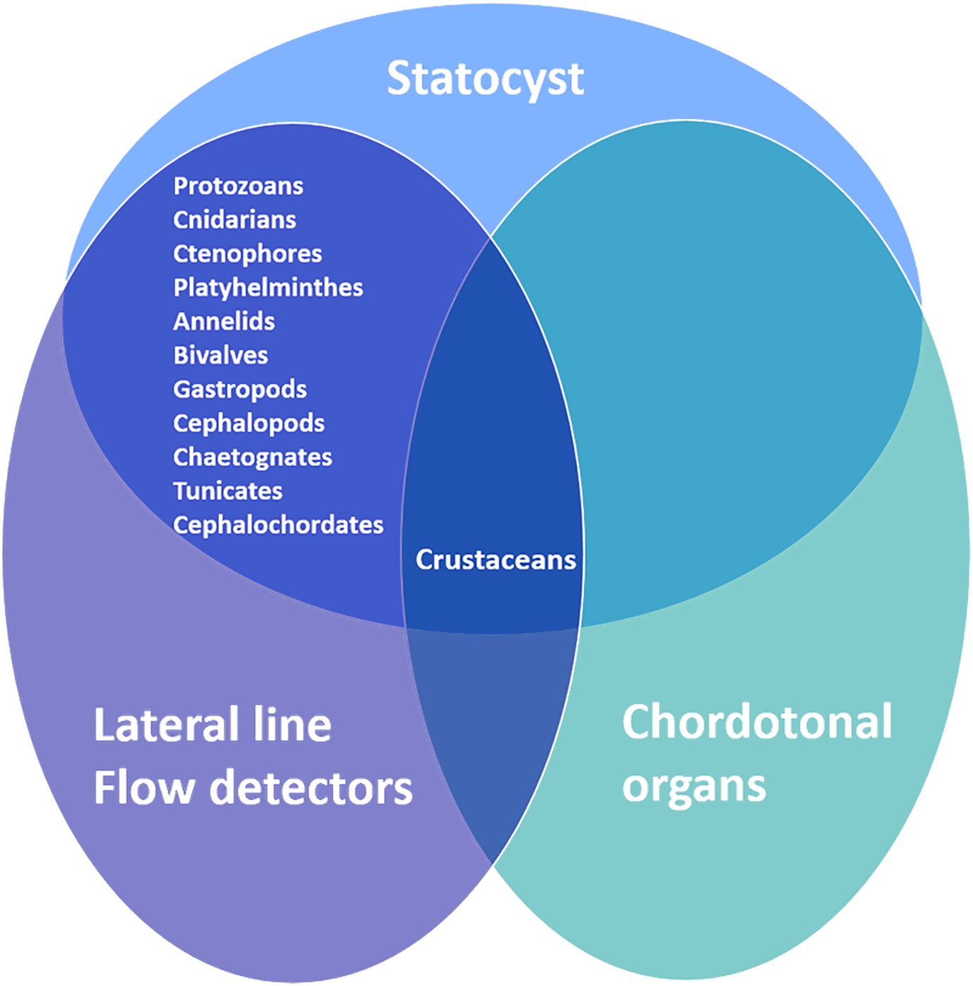 Mechanoreceptors are sensory cells (hair cells) detecting mechanical forces that usually bear specialized cilia (Figure 1). These mechanosensory cells are the starting point of mechanotranduction processes in which the hair cells express transmembrane channels that convert force into cellular signal. Hearing, proprioception or gravity mechanisms are based in these mechanosensory cells (Bezares-Calderón et al., 2020). These receptor systems can be found on the body surface of animals or enclosed in fluid-filled cavities. Hair cells possess unique features including the presence of cilia (microtubule with a basal body which contains organelles) that can be motile or not and, a tuft of stereovilli (actin-filled microvilli). Unlike vertebrates that are characterized by the presence of a single cilia with a 9 + 2 axoneme and a group of stereovilli, invertebrates generally have kinocilia (with an internal structure of 9 x 2 + 2 microtubules in the axoneme) in their hair-cell-based receptor systems. The number of kinocilia per cell varies according to the group of invertebrates (e.g., cnidarians: monociliary cells with a concentric or eccentric bundle of stereovilli; cephalopods: multiciliary cells with microvilli; crustaceans: monociliary cells without microvilli; Figure 1). Some mechanosensory systems present accessory structures (statolith, statoconia, cupula) above the hair cells which stimulate the underlying sensory epithelia. The kinocilia are mechanically directly or indirectly (via a cupula) coupled with the surrounding fluid. An external stimulus causes the movement of an accessory structure or fluid which leads to the mechanical deflection of the cilia, and stimulates the sensory cells. These hair cells may appear in the form of primary (specialized neurons with an axon leaving the cell) or different types of secondary sensory cells (without an axon) that make afferent synaptic contacts with first-order afferent neurons. Hair cells and neurons receive numerous efferent endings (Budelmann, 1989) and are responsible from the information transmission to the nervous system. Depending on the direction of deflation of the kinocilia, the amount of neurotransmitter release will be different, causing an excitation or inhibition response and serving to regulate a wide range of behaviours.
