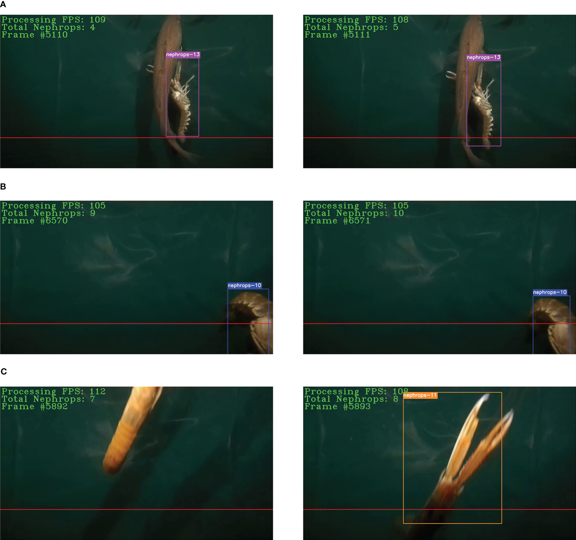 In order to determine the count for the Nephrops catches, the tracks output by the SORT tracker are checked. This is done with the help of a horizontal level defined at the top 4/5 of the frame height. When the Nephrops are leaving the frame from the bottom, they are partly visible, and this may cause the object tracker to assign different identities to the same Nephrops as they are about to disappear. Such an identity switch may generate false positive counts if the horizontal threshold is set to be the bottom of the frame. This is the reason for selecting a level different than the bottom of the frame.