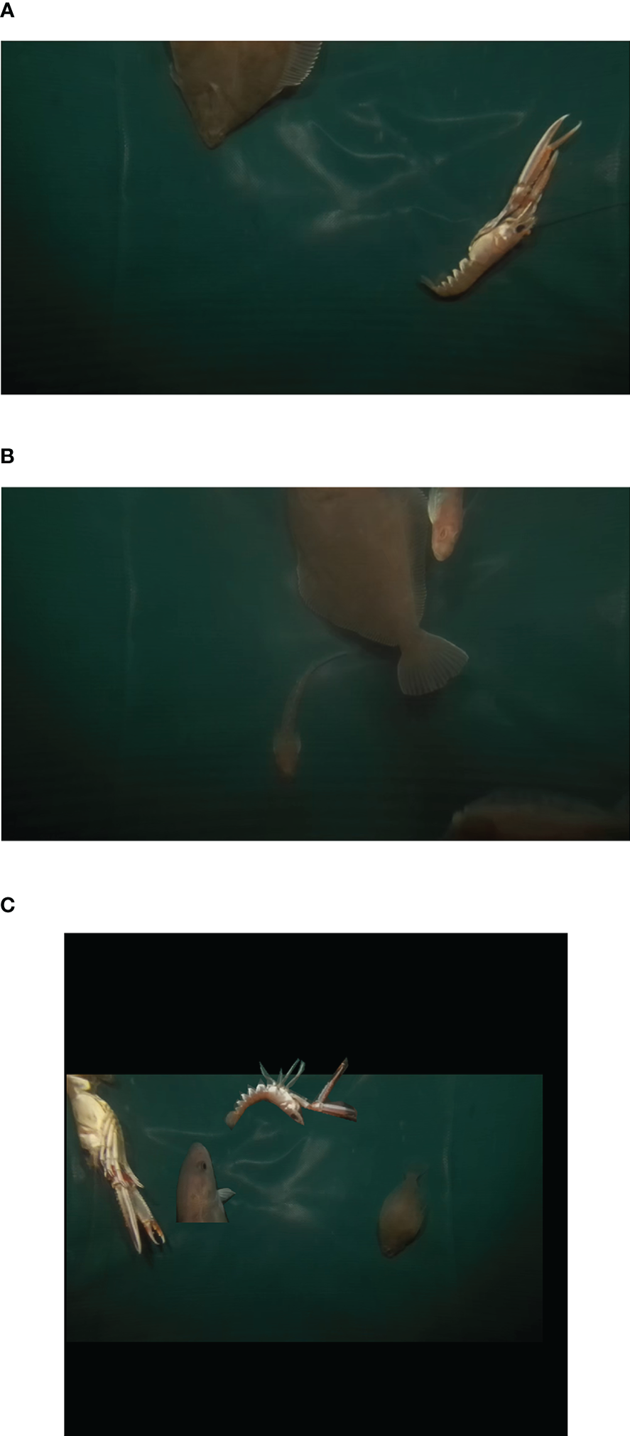 Samples from the image dataset. (A) An image with a Nephrops instance. (B) An image with some other instances. (C) An image with copy-paste augmentation.