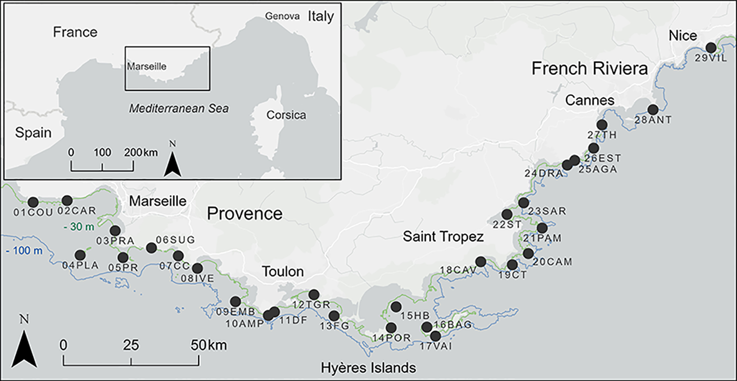 Study area along the French Mediterranean coast and location of the 29 sampling sites.