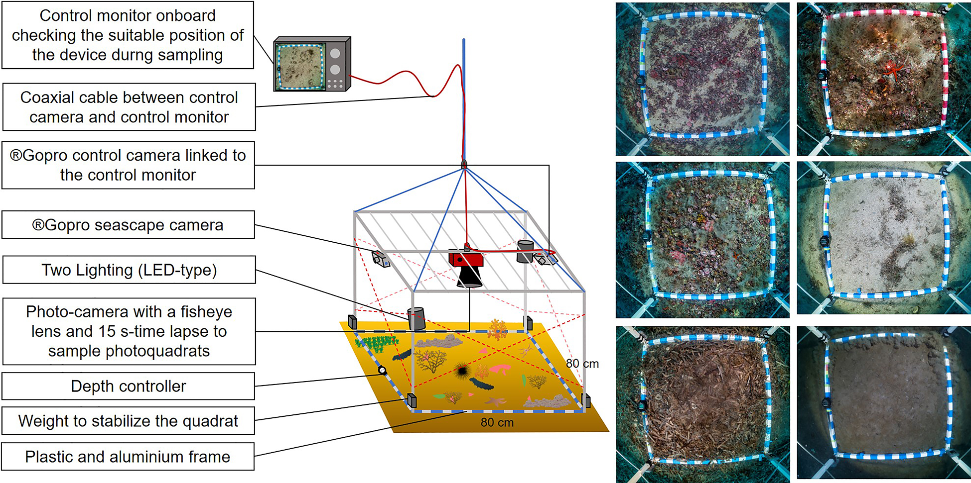 Diagram of the Biocube device. The pictures on the right show different types of CDB sampled on photoquadrats.