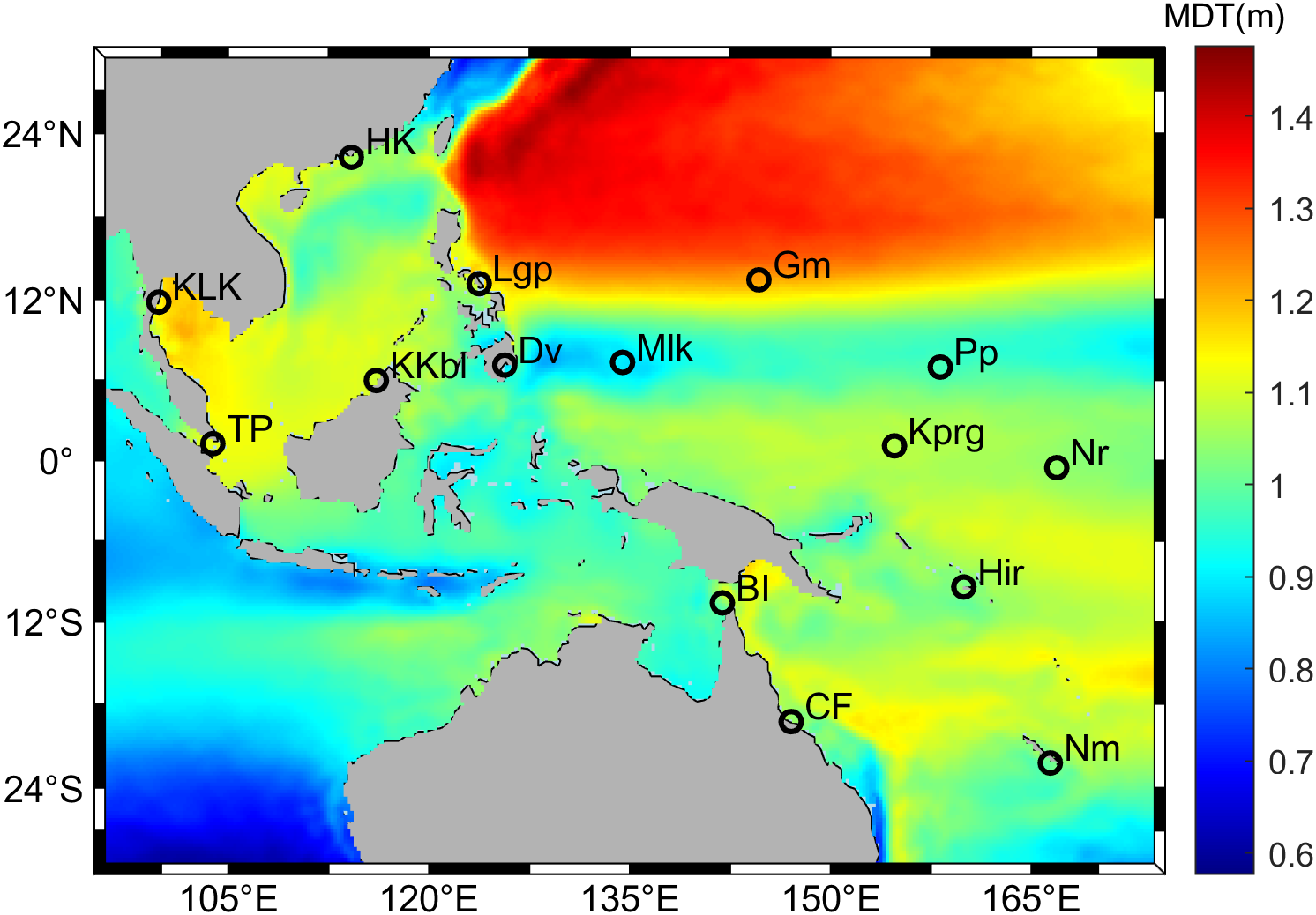Mean dynamic topography over the study region based on the CNES-CLS18 dataset (Mulet et al., 2021) and the locations of 15 selected tide gauges: Pohnpei (Pp), Nauru (Nr), Malakal (Mlk), Honiara(Hir), Noumea (Nm), Kapingamarangi (Kprg), Guam (Gm), KoLaK (KLK), HongKong (HK), Booby Island (BI), Cape Ferguson (CF), Legaspi (Lgp), Davao (Dv), Kota Kinabalu (KKbl), Tanjong Pagar (TP).