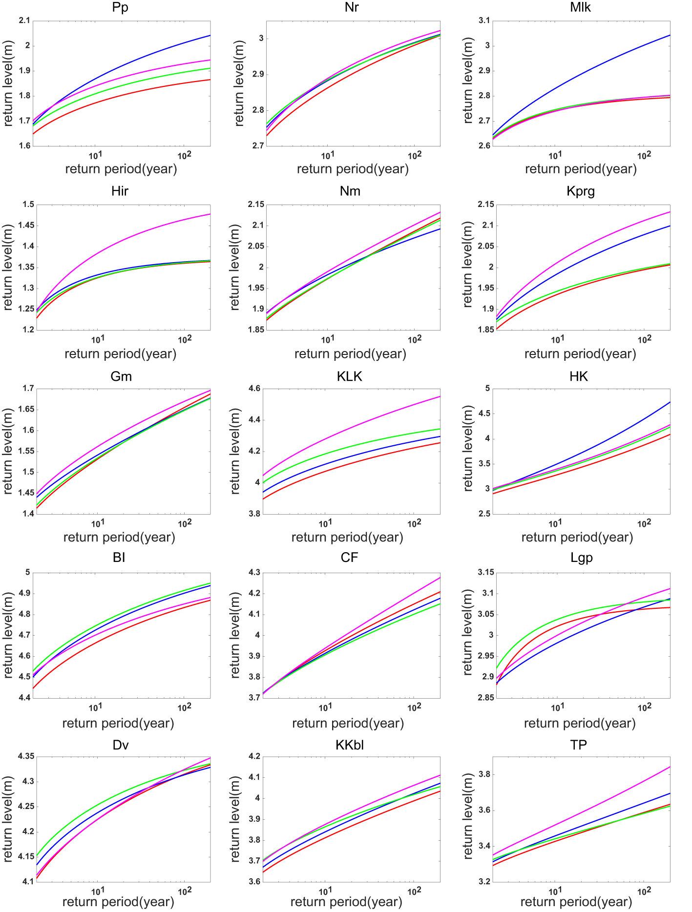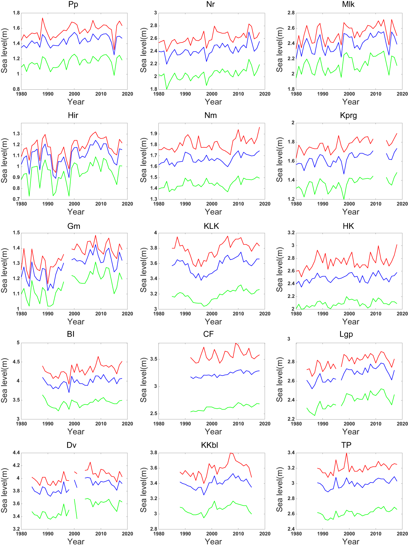 The tide gauge sea level data used in this study are collected and distributed by University of Hawaii Sea Level Center, one of the primary data centers in the Global Sea Level Observing System. The accuracy and completeness of the data are critical for correct estimations of ESL changes. So only hourly Research Quality (RQ) data with more rigorous quality control are adopted in this study. Given that the earlier tide gauge data has lower completeness, we focused on the RQ data during the period January 1980 - December 2018 and required the time series to contain at least 25 years of data, resulting in 15 stations. The locations and names of the selected tide gauge stations are shown in Figure 1. In addition, obvious spurious records or abnormal data spikes in the sea-level time series of all tide gauges were checked by visual inspections and then further corrected or eliminated. For instance, in the sea-level records of a few stations (e.g. Hir, Lgp), an overall drift with anomalously large amplitude occurs after a certain point in time, probably due to the artificial relocation of tide gauge. To correct these abrupt sea-level shifts, the abnormal differences between adjacent records were replaced by the differences between their corresponding climatological mean values during 1980-2018.