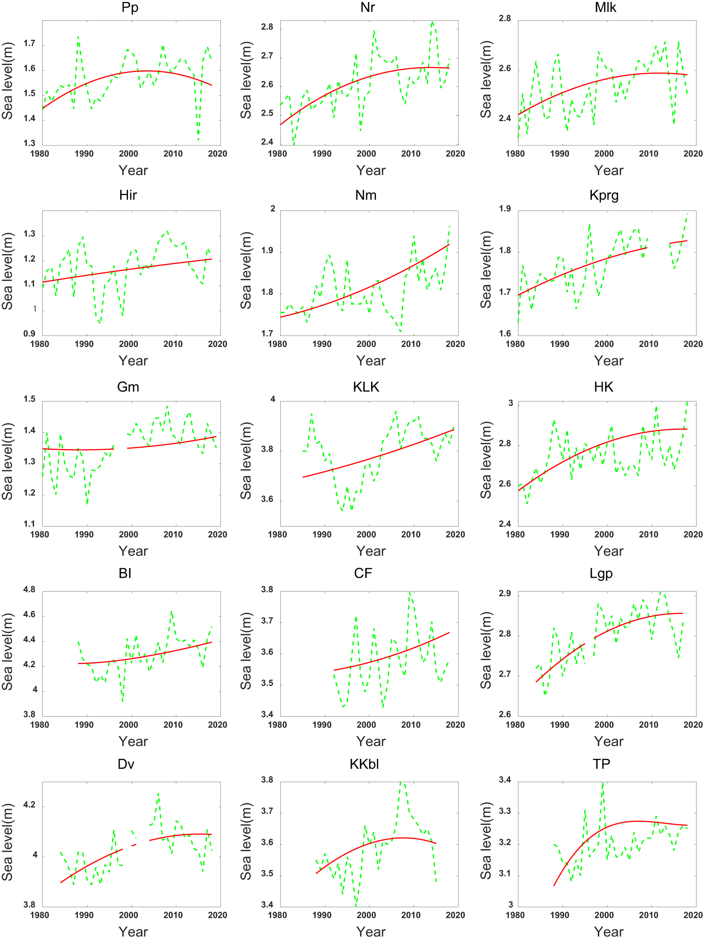 The EEMD method is used to further extract the long-term nonlinear trends of ESLs in coastal and island zones of the tropical western Pacific. As seen in Figure 3, ESLs along the coasts and islands of the tropical western Pacific generally present rising trends during 1980-2018. But the detailed tendency features of ESLs at different tide gauges are distinct. At Hir and KLK, the growing trends are almost linear. At Nm, Gm, BI, and CF, the growing trends are not obvious initially but strengthen gradually. At Nr, Mlk, Kprg, HK, Lgp, and Dv, the rising trends weaken gradually. At Pp, KKbl, and TP, the ESLs show obvious rising trends before 2005 and then shift to decline afterward. It should be noted that the long-term trend derived via EEMD method may be significantly influenced by extreme anomalies in some specific years. For example, at Pp, the decline trend after 2000 is primarily caused by the large negative anomalies of sea level in 2015.