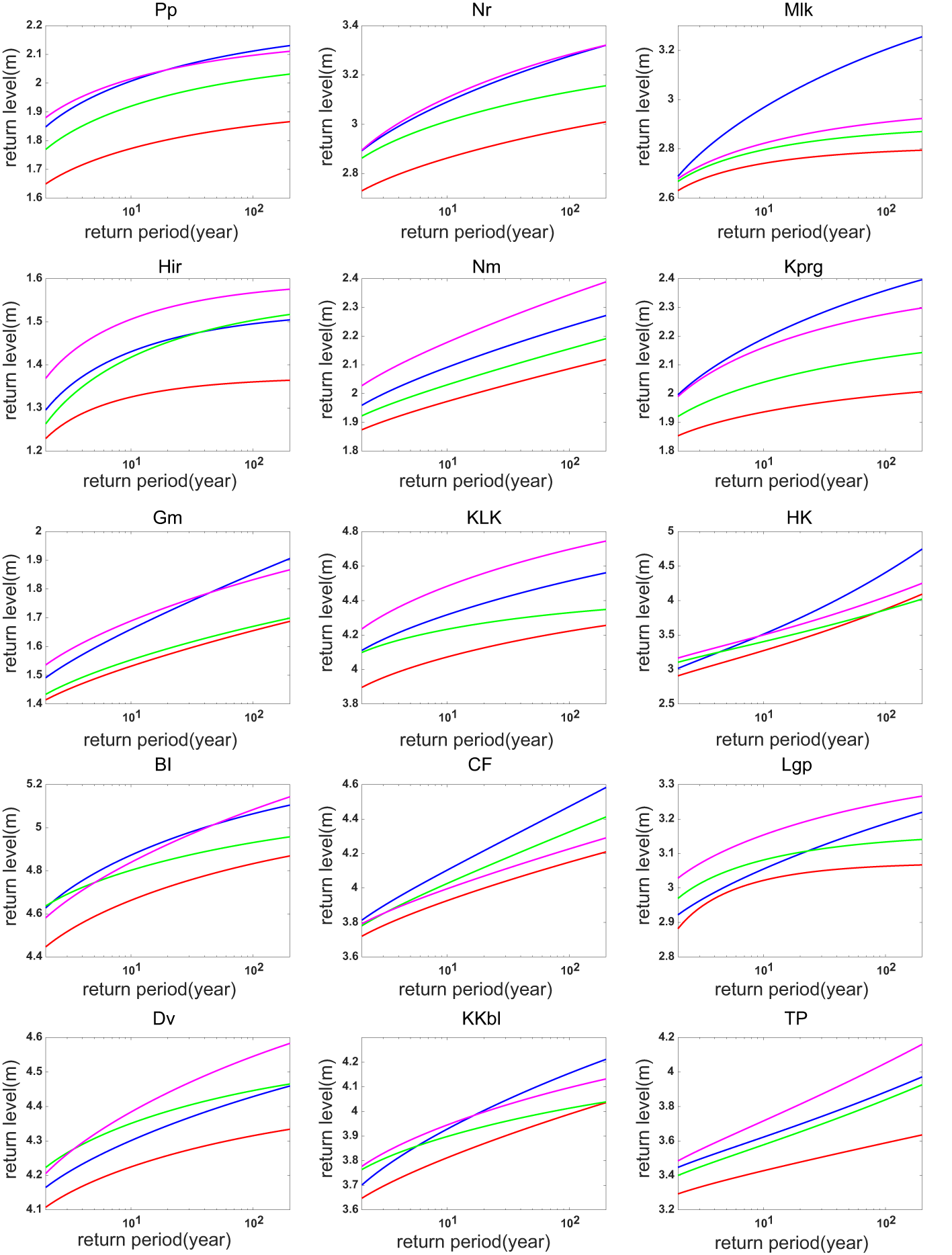 Return levels of the ESL at present (red line) and under the 2.0°C warming scenario: MIROC6 (blue line), CMCC-ESM2 (green line), EC-Earth3 (pink line).