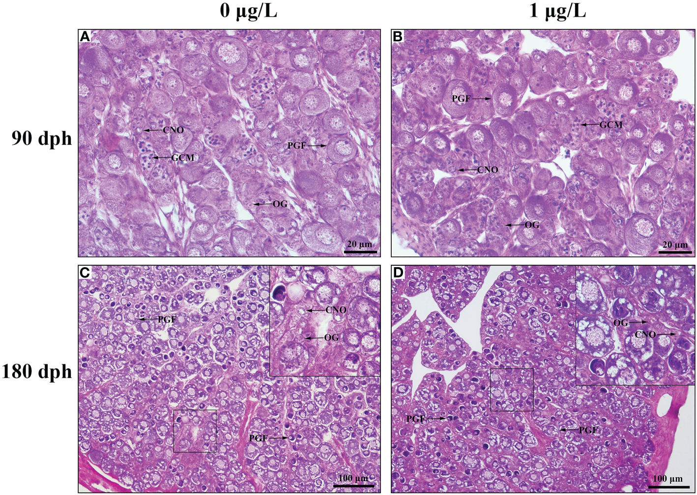 Photomicrographs of ovary in control and E2-exposed female tiger puffer at 90 and 180 dph. (A) Ovary in control female at 90 dph; (B) Ovary in E2-exposed female at 90 dph; (C) Ovary in control female at 180 dph; (D) Ovary in E2-exposed female at 180 dph. CNO, chromatin-necleous oocyte; GCM, germ cells undergoing meiosis at zygotene stage; OG, oogonium; PGF, primary growth follicle.