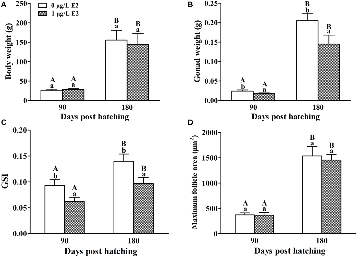 Effects of E2 on body weight (A), ovary weight (B), GSI (C) and maximum follicle area (D) in female tiger puffer after the exposure. Values represent mean ± SEM (n = 6). Uppercase letters indicate significant differences over time within the same group (P < 0.05). Lowercase letters indicate significant differences between groups within the same time (P < 0.05).